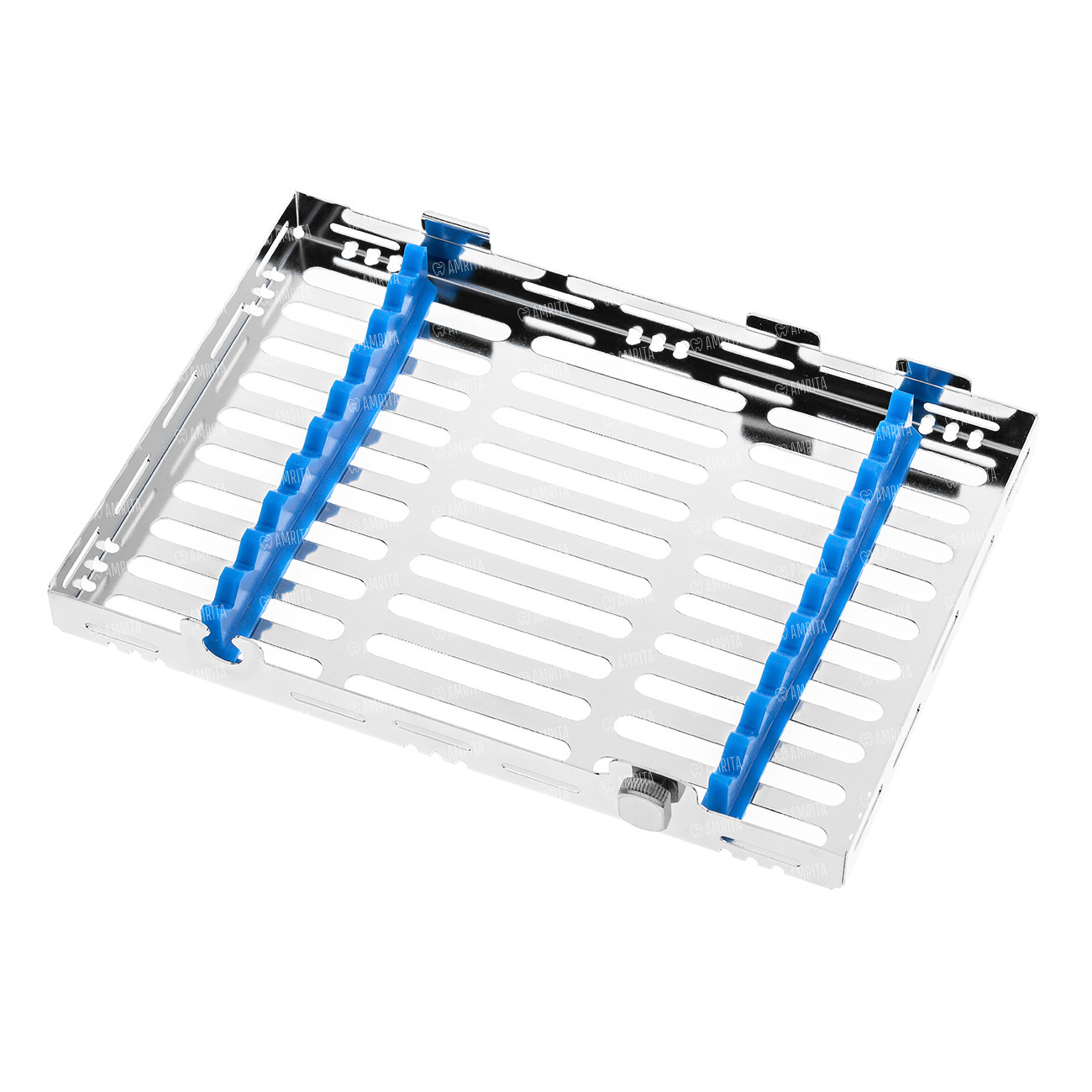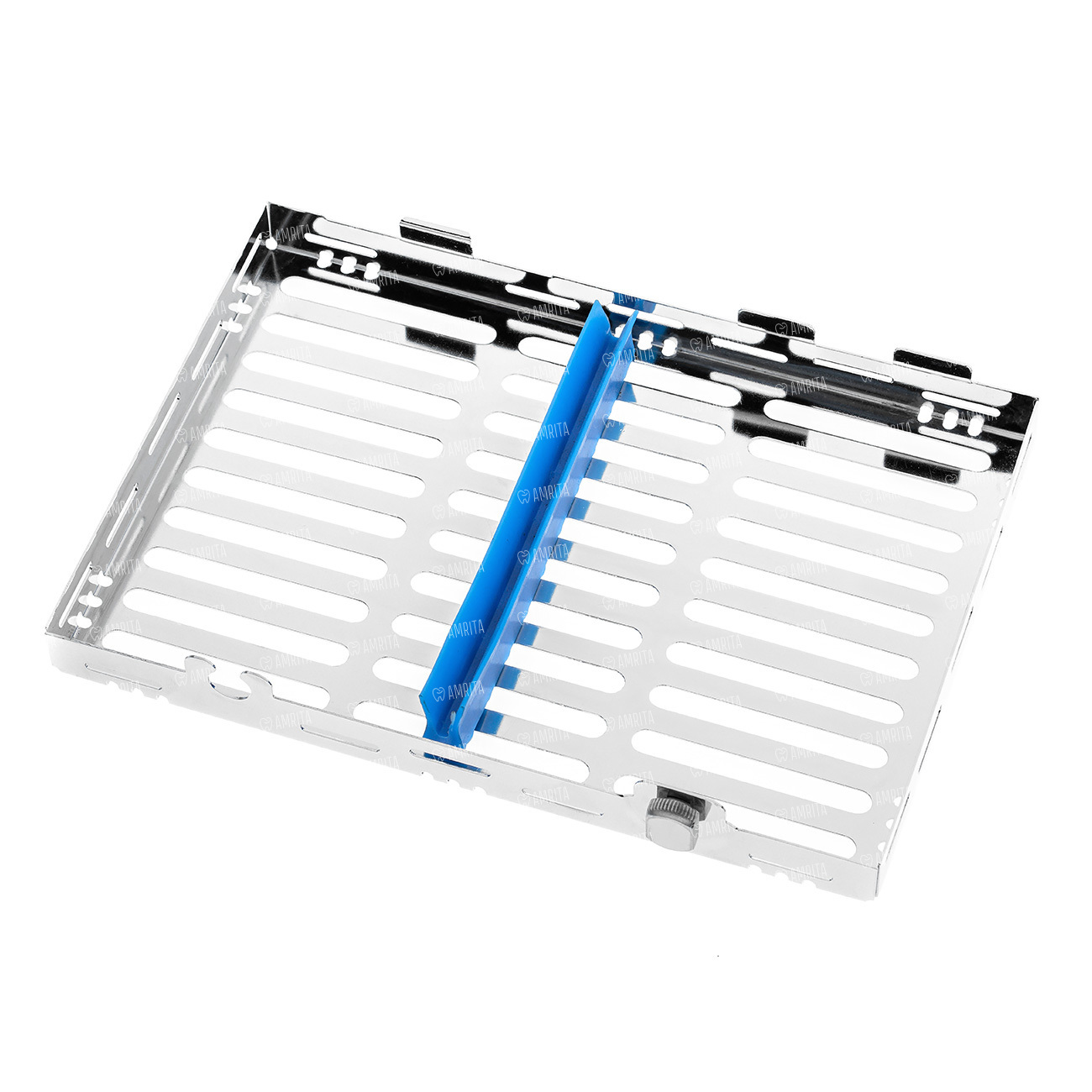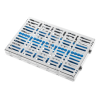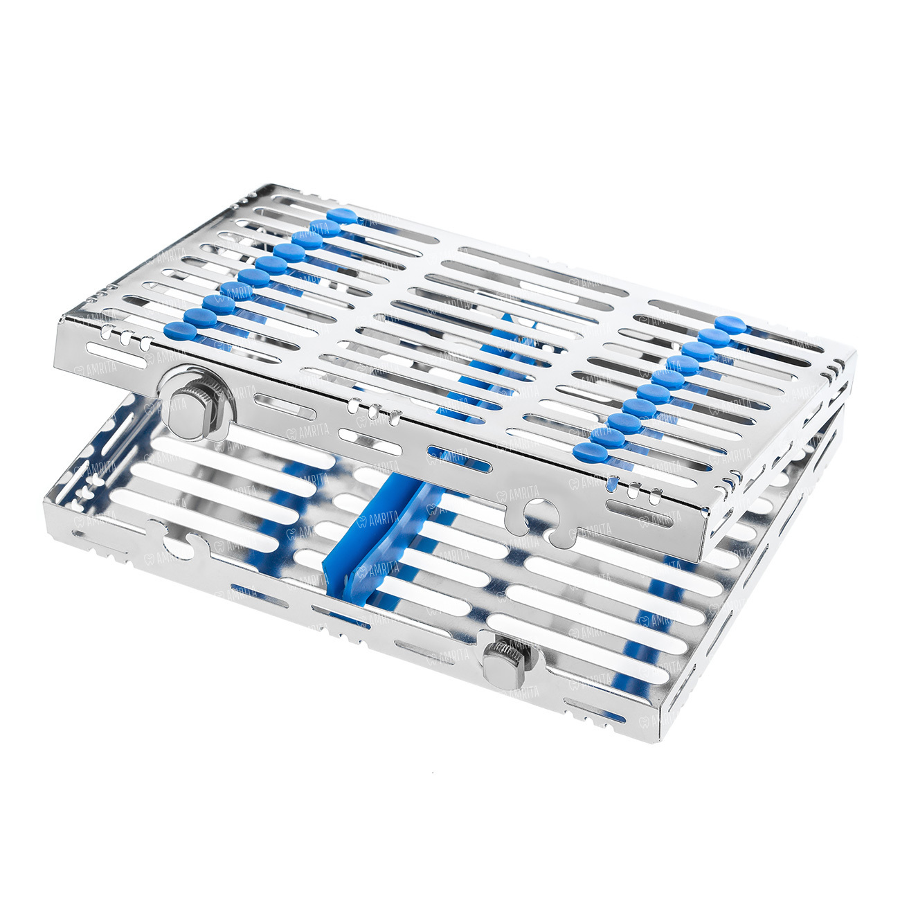 Лоток для хранения и стерилизации инструментов прямоугольный перформированный. Состояит из 2 частей, смыкаемых при закрывании и фиксируемых зажимными элементами на торцевой части. На продолжной оси лотка с внутренней стороны расположены ретенционные элементы, позволяющие удерживать инструменты в зафиксированном положении.