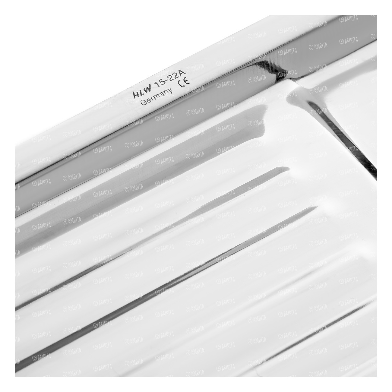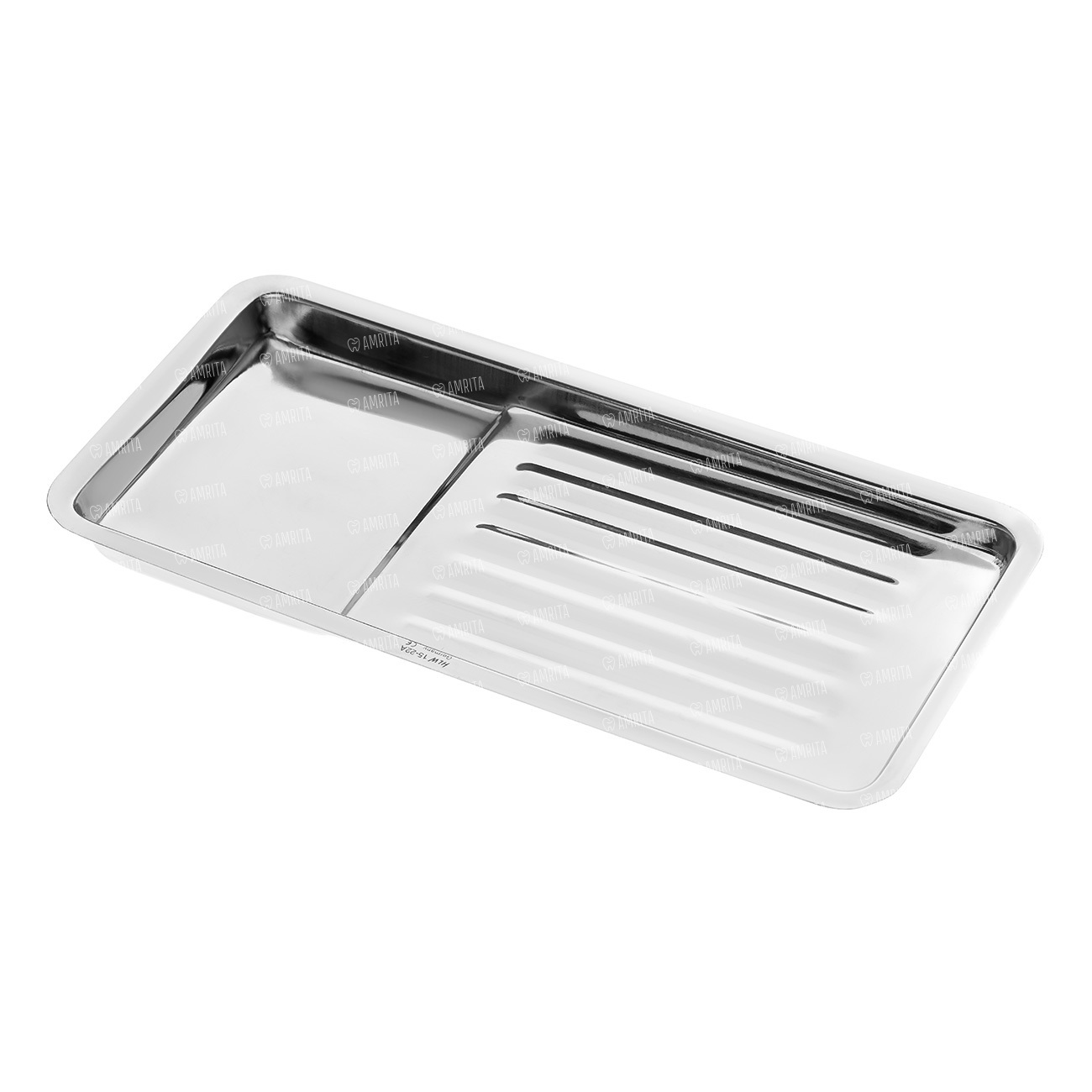Лоток для хранения и стерилизации инструментов прямоугольный. Грани лотка атравматичны. Лоток отполирован до зеркально блеска. Дно лотка имеет продольными ребра не менее 7 штук. Ширина лотка не менее 100 мм, а длина не более 200 мм.