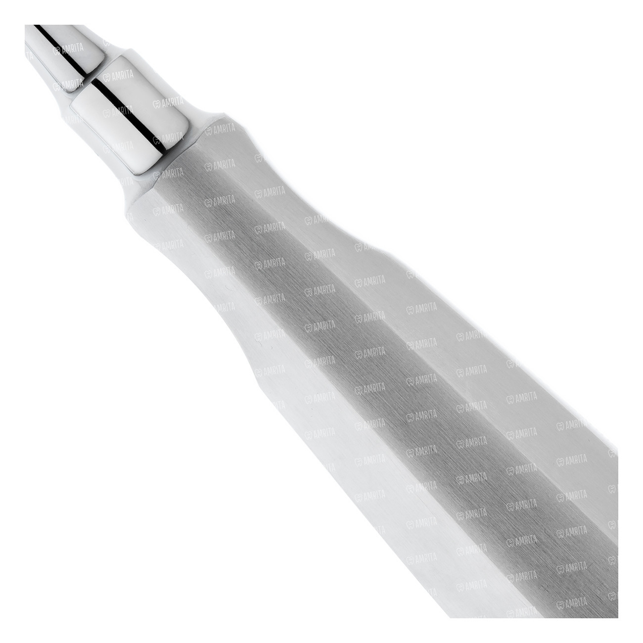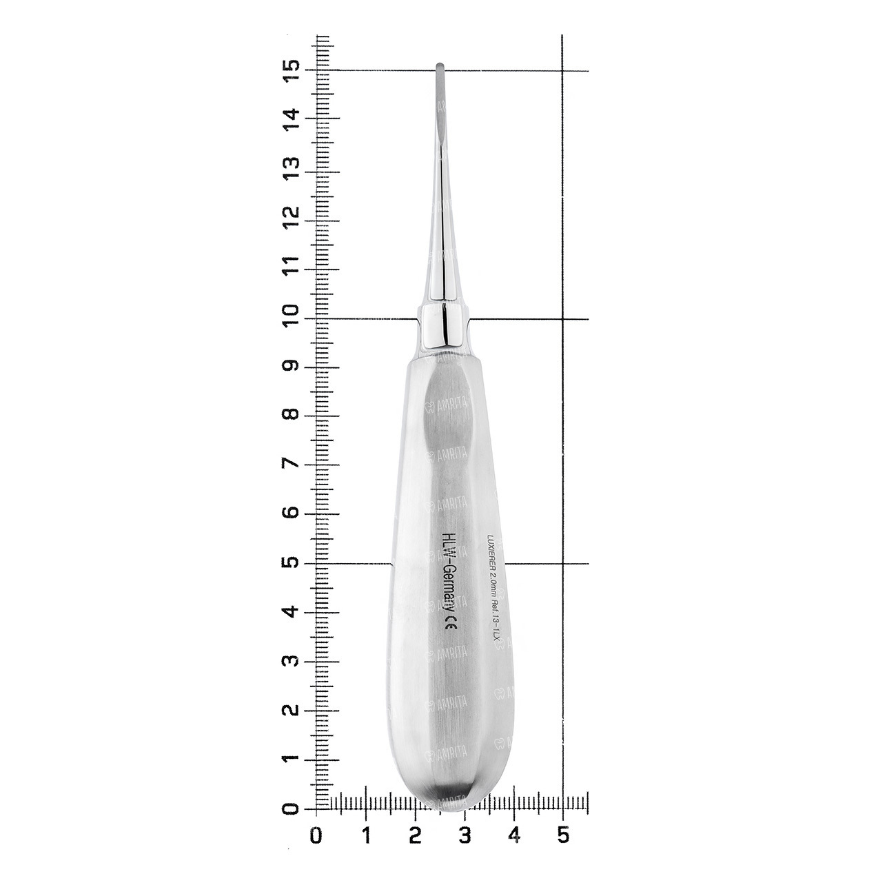 Прямой люксатор, имеющий лезвие шириной не более 2 мм, закруглённое на конце, полая ручка имеет эргономичную форму с выемками под пальцы для наилучшего захвата и удержания инструмента.