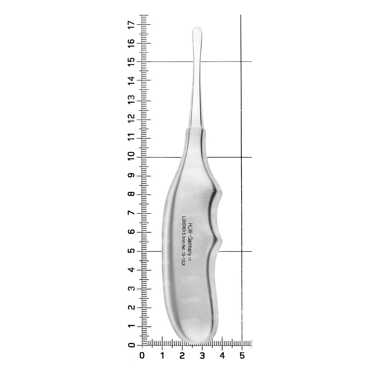 Прямой люксатор имеющий лезвие шириной не менее 5 мм, закруглённое на конце, полая ручка имеет эргономичную форму с выемками под пальцы для наилучшего захвата и удержания инструмента.