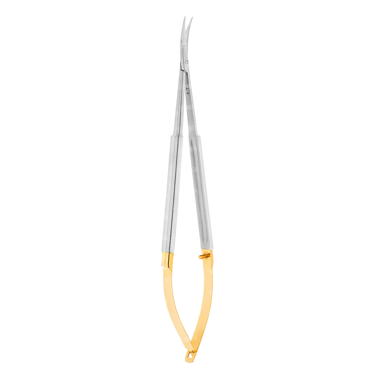 Ножницы микрохирургические изогнутые по плоскости конструкции КАСТРОВЬЕДЖО. Предназначены для прецизионных работ с мягкими тканями, вплоть до сосудов. Режущие части короткие, с ровной заточкой, остроконечные, выполнены из карбида-вольфрама.