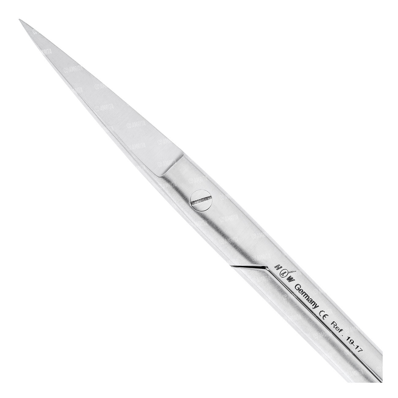 Ножницы прямые хирургические остроконечные. Предназначены для рассечения соединительнотканных и мышечный тяжей «на зажиме», осуществления полутупого доступа, к примеру при выделении новообразований в толще тканей или мобилизации краев раны.