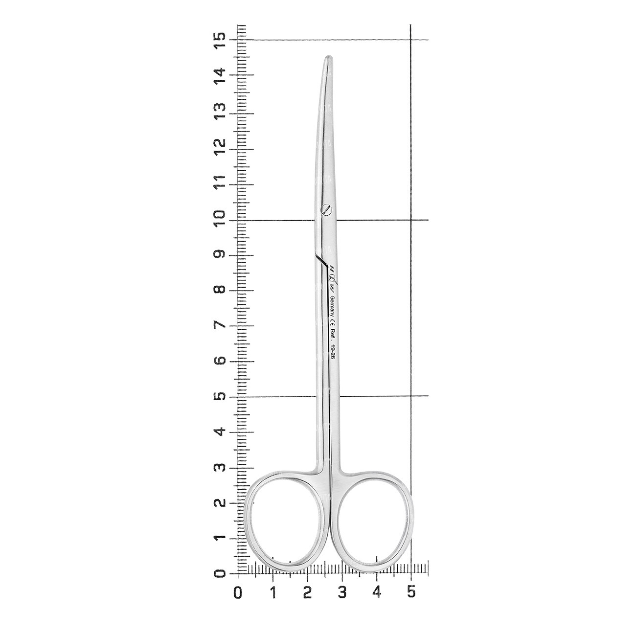 Ножницы изогнутые конструкции МЕТЗЕНБАУМА (по автору). Имеют симметричные закругленные рабочие части, которые истончаются к вершине. Рабочие части имеют гладкую оструб заточку и самозатачивающийся эффект. Держатели имеют стандартную кольцевую форму. Общая длина инструмента не менее 14 см.