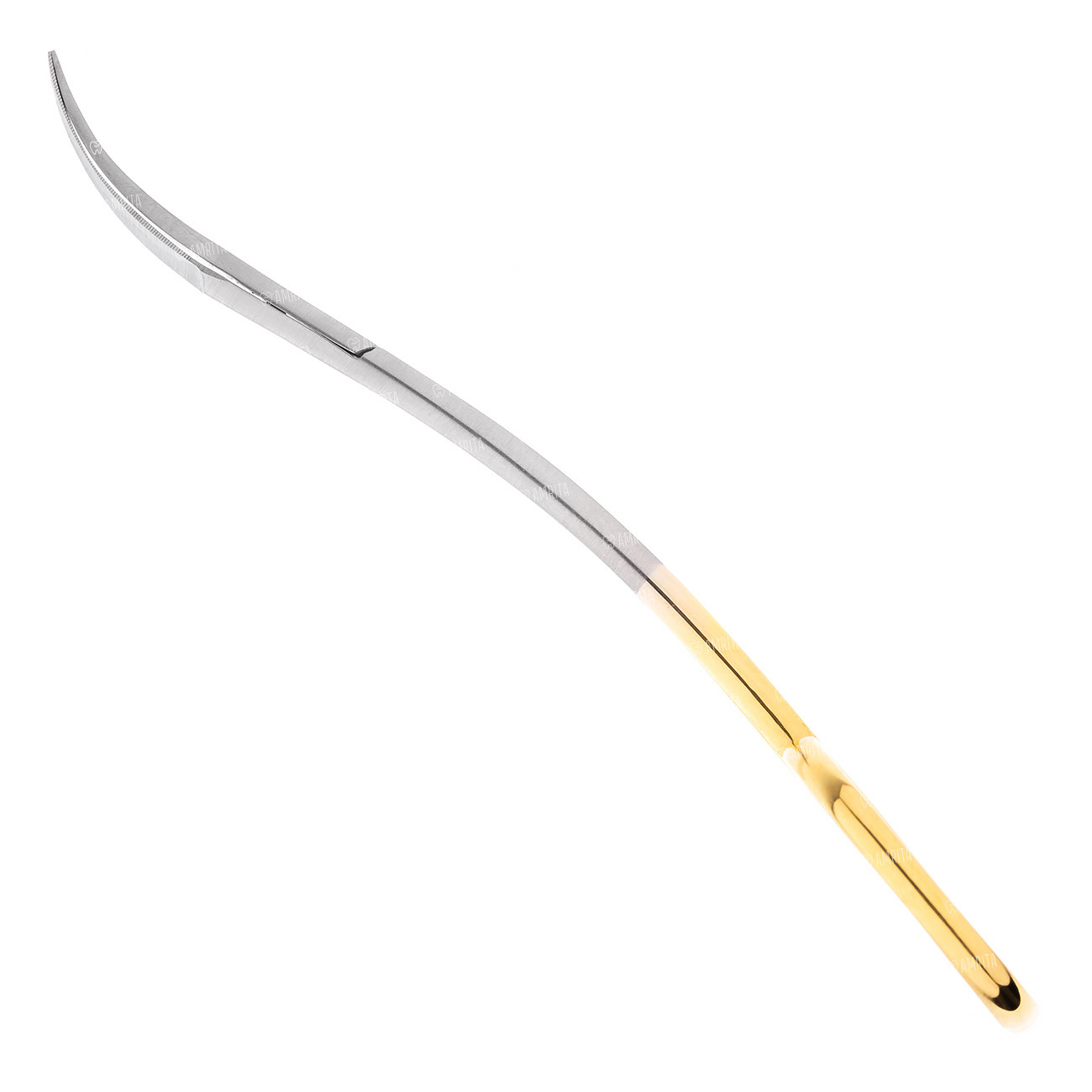 Ножницы хирургические для мягких тканей с двойным изгибом по плоскости конструкции ЛА ГРАНША. Имеют стандартные кольцевые держатели с маркировкой золотого цвета, промежуточную часть с двойным разнонаправленным изгибом по плоскости, и остроконечные рабочие части с серейторной заточкой.