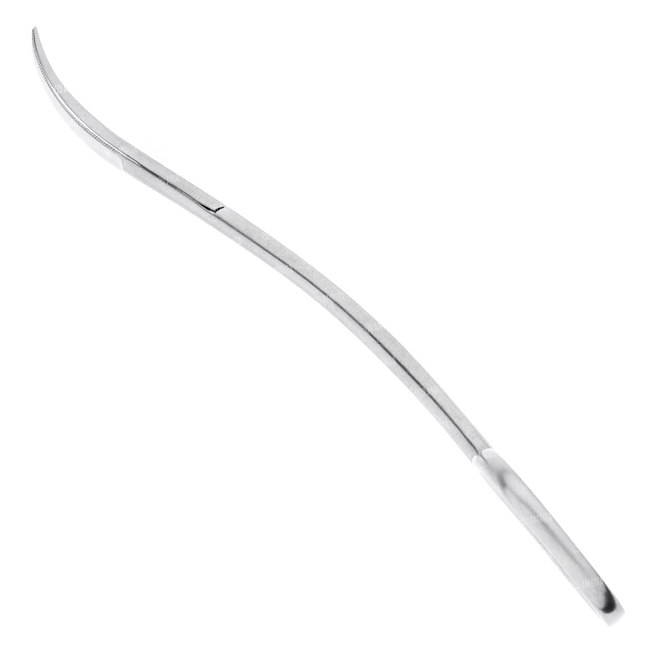 Ножницы хирургические для мягких тканей с двойным изгибом по плоскости конструкции ЛА ГРАНША. Имеют стандартные кольцевые держатели, промежуточную часть с двойным разнонаправленным изгибом по плоскости, и остроконечные рабочие части с серейторной заточкой.