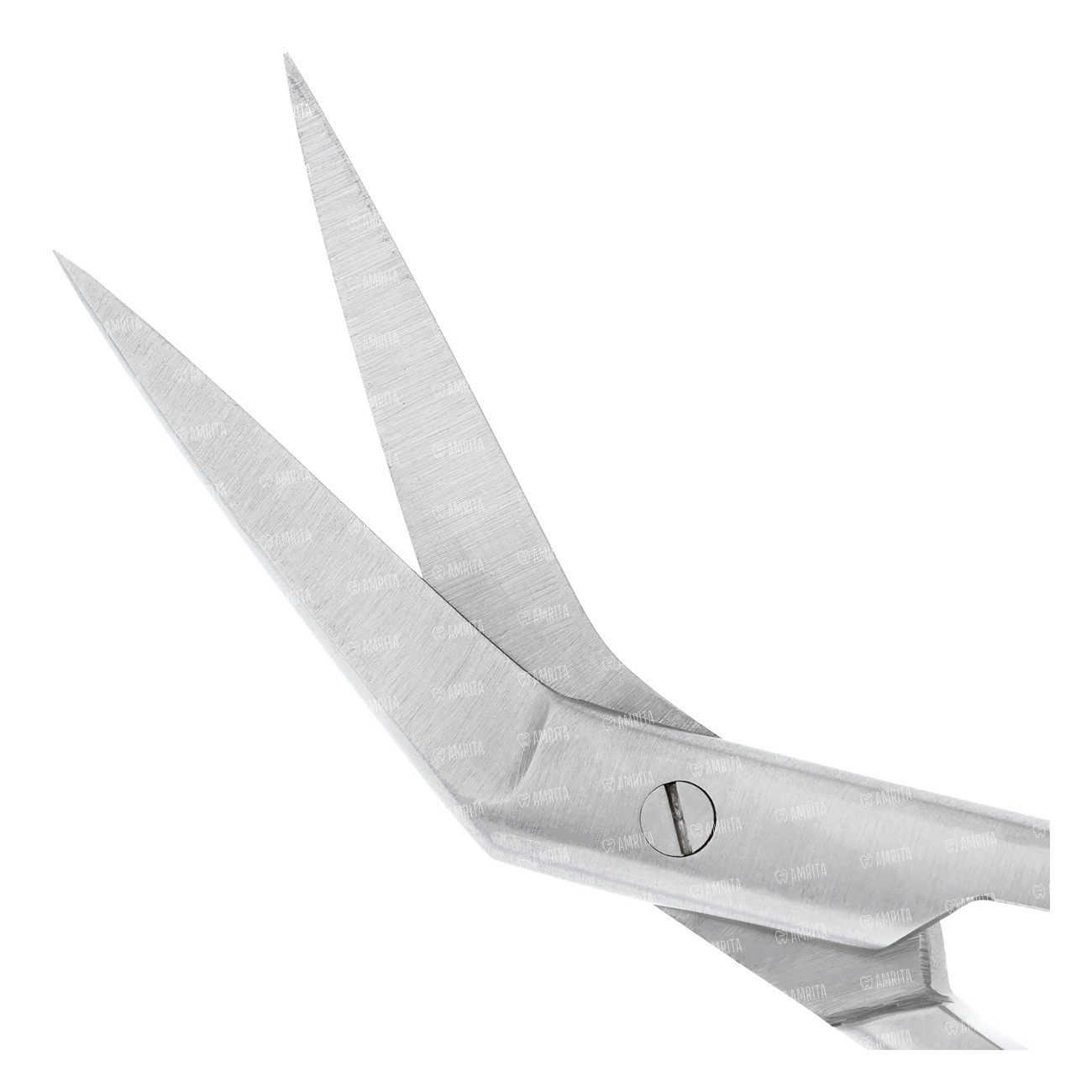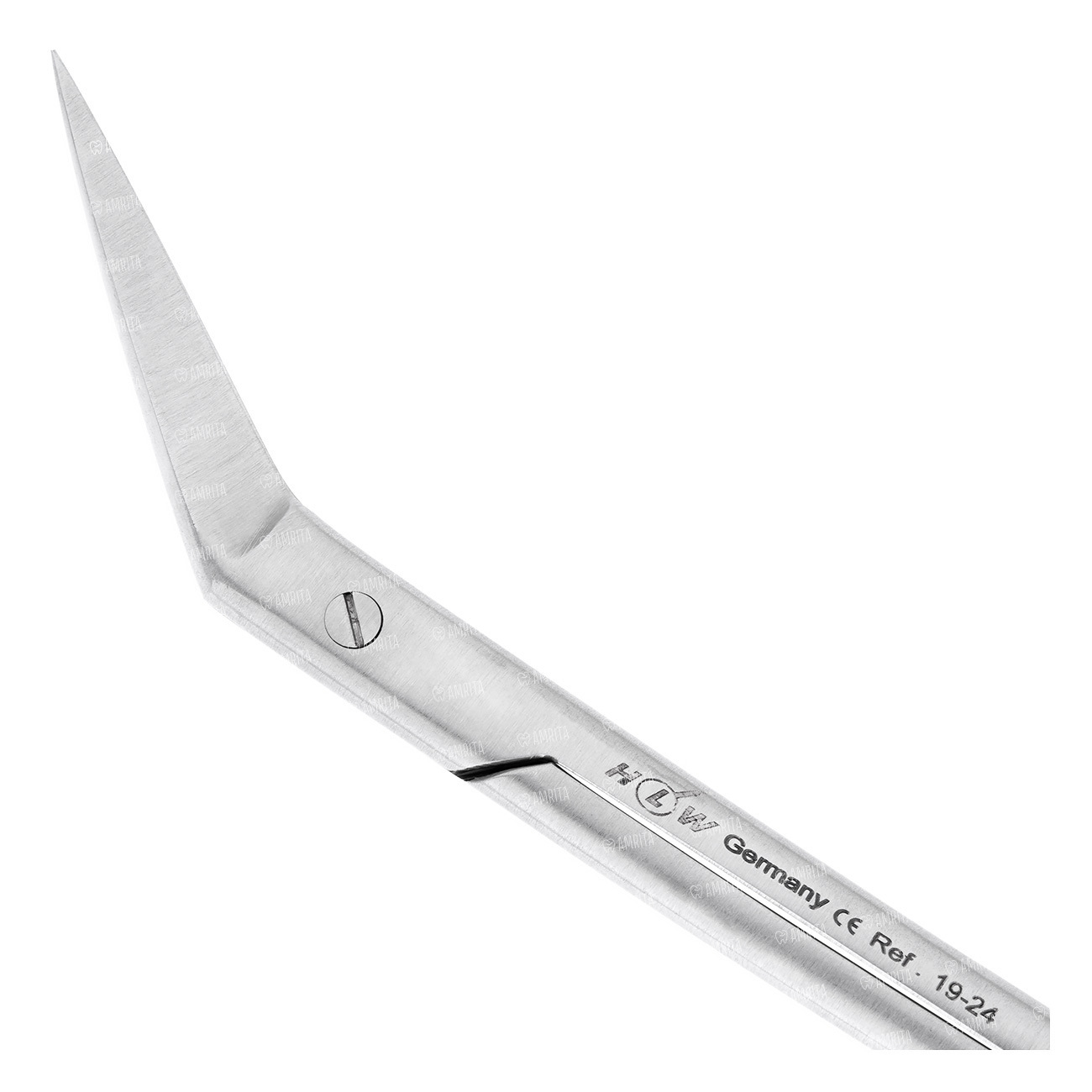 Ножницы угловые остроконечные для снятия швов конструкции ФАДЕНШИРА (по автору). Рабочая часть отклонена от продольной оси инструмента на угол в 45 градусов, однако находится в той же плоскости, что и сам инструмент. Режущие поверхности имеют среднюю длину и стандартную для ножниц заточку.