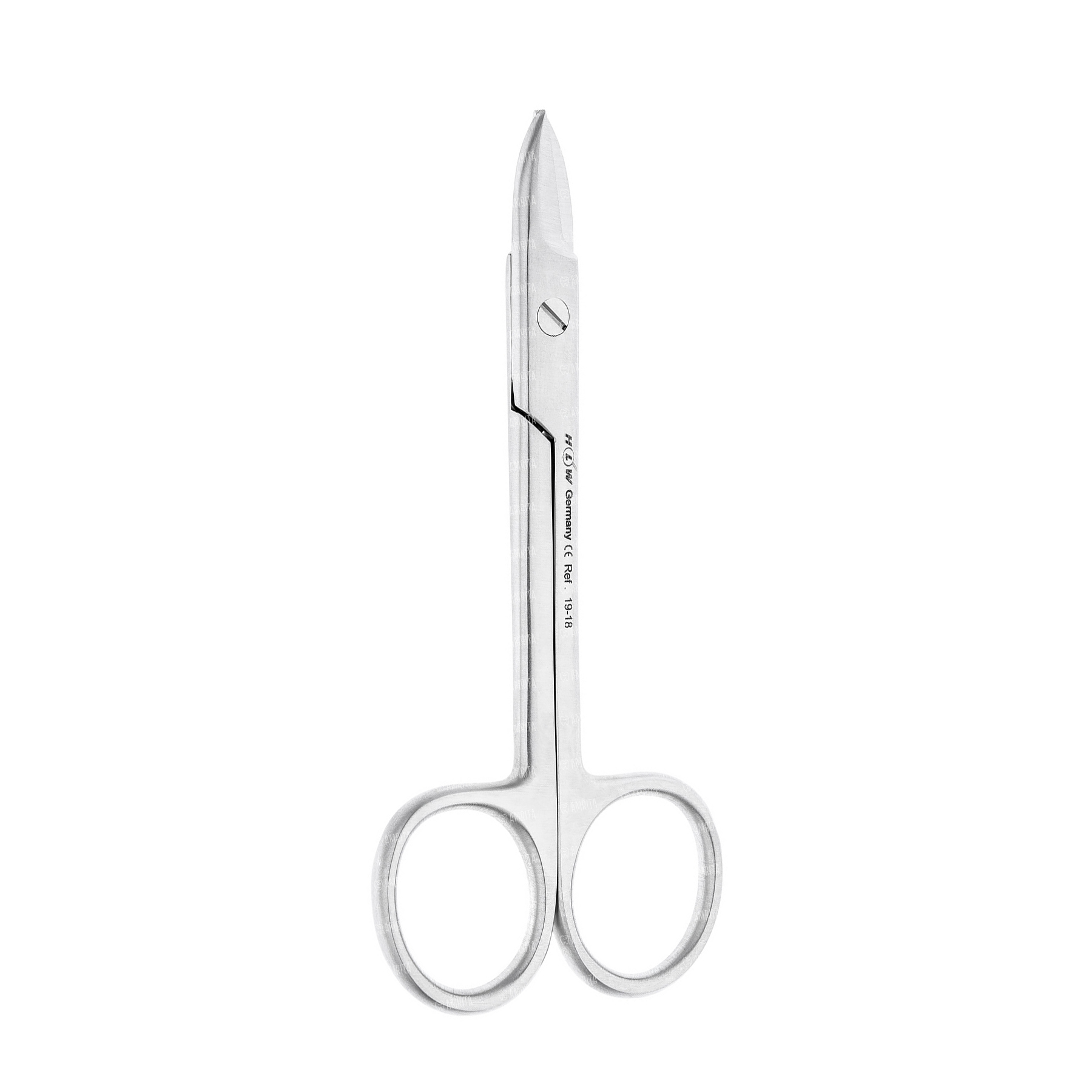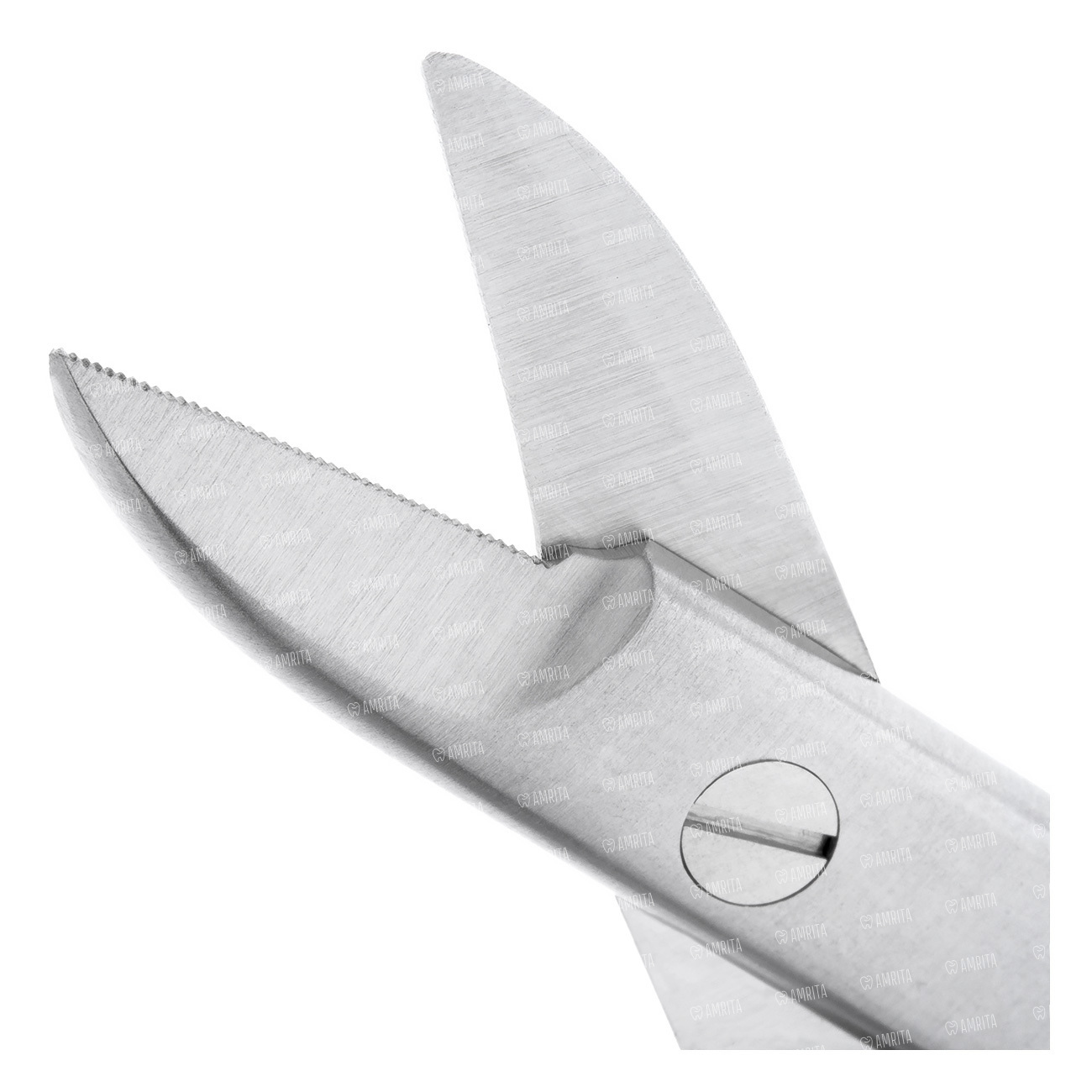 Коронковые ножницы, длинной не более 10 см, рабочая часть имеет зубчатую поверхность, предназначены для разрезания металических коронок, инструмент с рабочими частями в виде движущихся навстречу друг другу бранш с режущими поверхностями, скрепленных между собой в плоскости винтом.