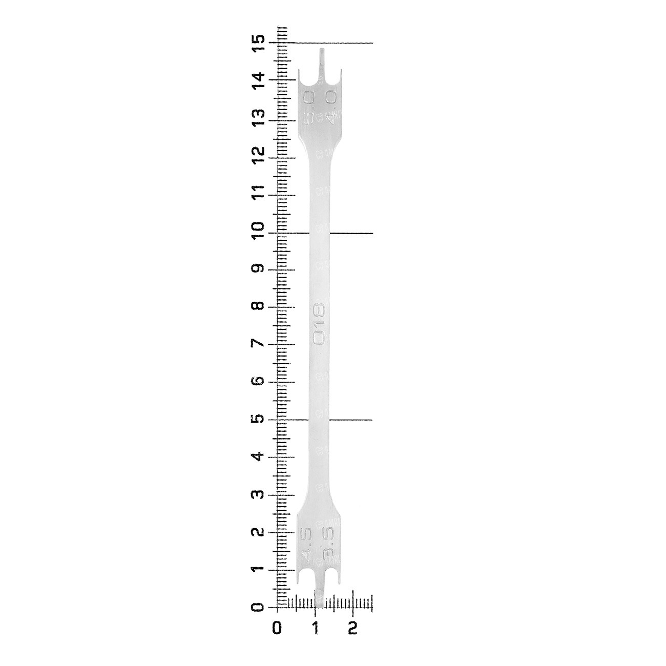 Инструмент для позиционирования элементов ортодонтической конструкции на вестибюлярной или лингвальной поверхности зуба путем установки инструмента на окклюзионной поверхности. Имеет выемки с различной глубиной от 3,5 до 5 мм и паз.018.