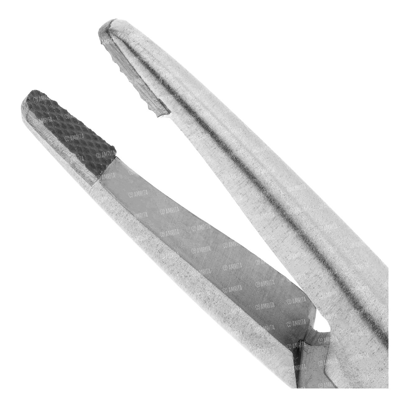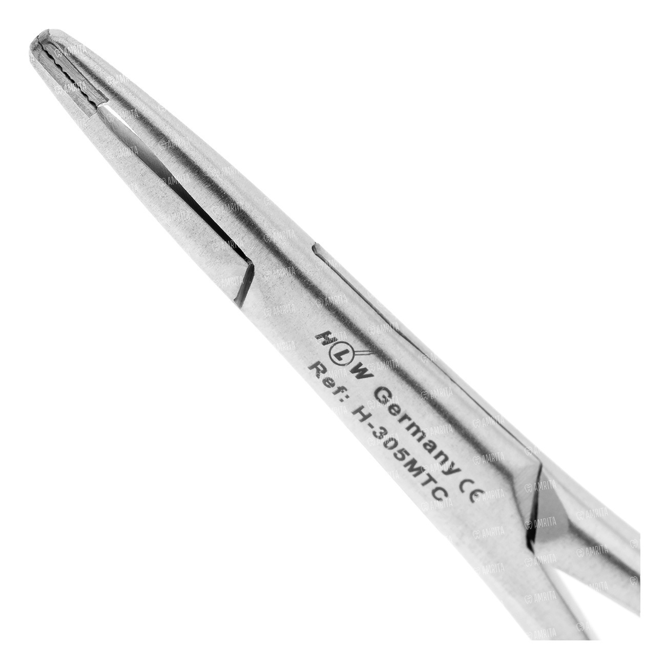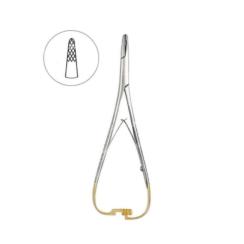 Иглодержатель безкольцевой конструкции МАТЬЕ (по автору). Рабочие части иглодержателя имеют закругленный кончик и укороченную широкую форму с параллельными стенками, внутренняя поверхность браншей имеет вклеенные вставки из твердого сплава и ретенционный диагональный микрорельеф. При переходе от рукояток инструмента к узкой рабочей части присутствует уступ с обеих сторон рабочей части. Промежуточная часть переходит в рукоятки, покрытые поперечными углублениями предотвращения скольжения в руке. На внутренней поверхности браншей имеется обращенная к рабочей части разводная пластиночная пружина. Рукоятки заканчиваются плавным изгибом в 90 градусов по ребру, и переходят в нажимной трехступенчатый фиксатор. Общая длина инструмента не более 140 мм. Мартенситная сталь DIN 1.4006, X10Cr13 (ГОСТ 12X13). Твердость по Роквеллу 40-45 RW. Твердость вставок не менее 65 RW.