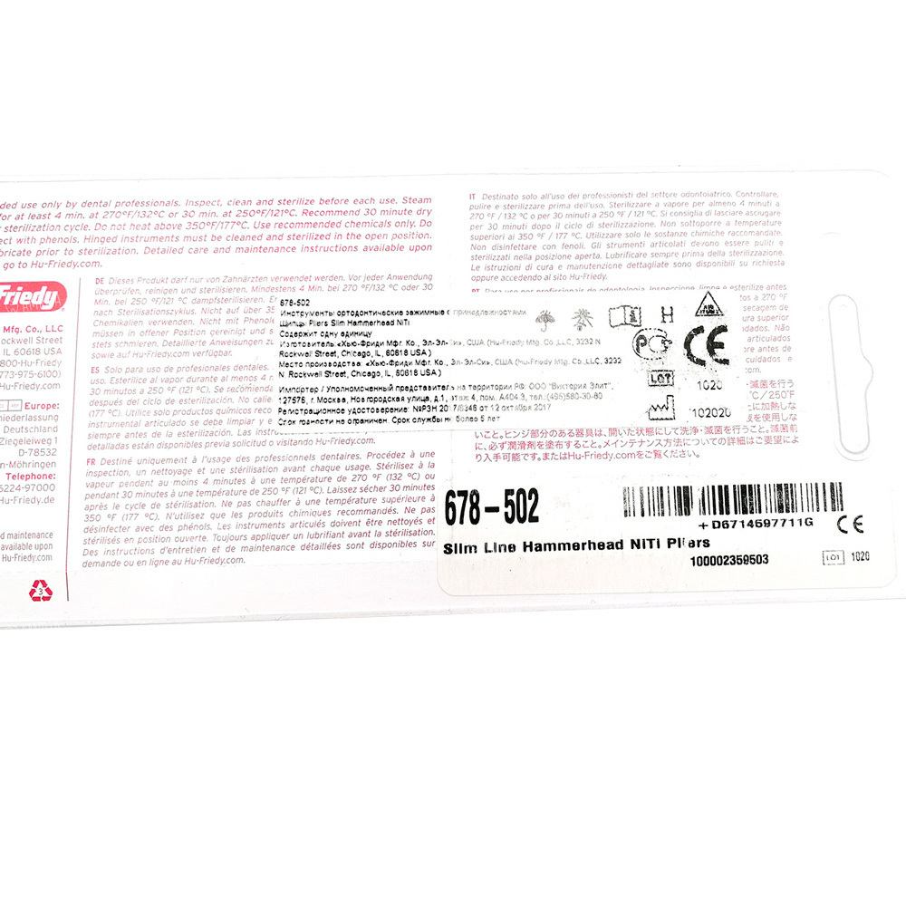 Щипцы с тонким профилем от Hu-Friedy используются для изгибания нитиноловой дуги. Узкие щечки помогают работать на труднодоступных участках полости рта. Конструкция рабочих частей позволяет легко изгибать дугу даже без нагрева. Модель подходит для гибки NiTi до 0.64 мм.