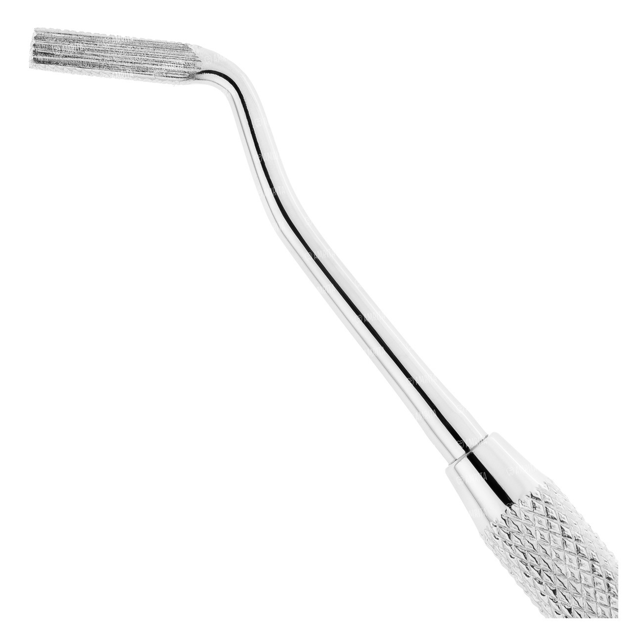 Ручной двусторонний инструмент, выполненный в форме стержня с заостренными рабочими частями различной формы. Одна рабочая часть представлена в форме серповидного скейлера с массивными режущими гранями, вторая развернута на 90 градусов по продольной оси инструмента и уплощена, имеет прямоугольную форму и продольные желобки от начала до окончания.