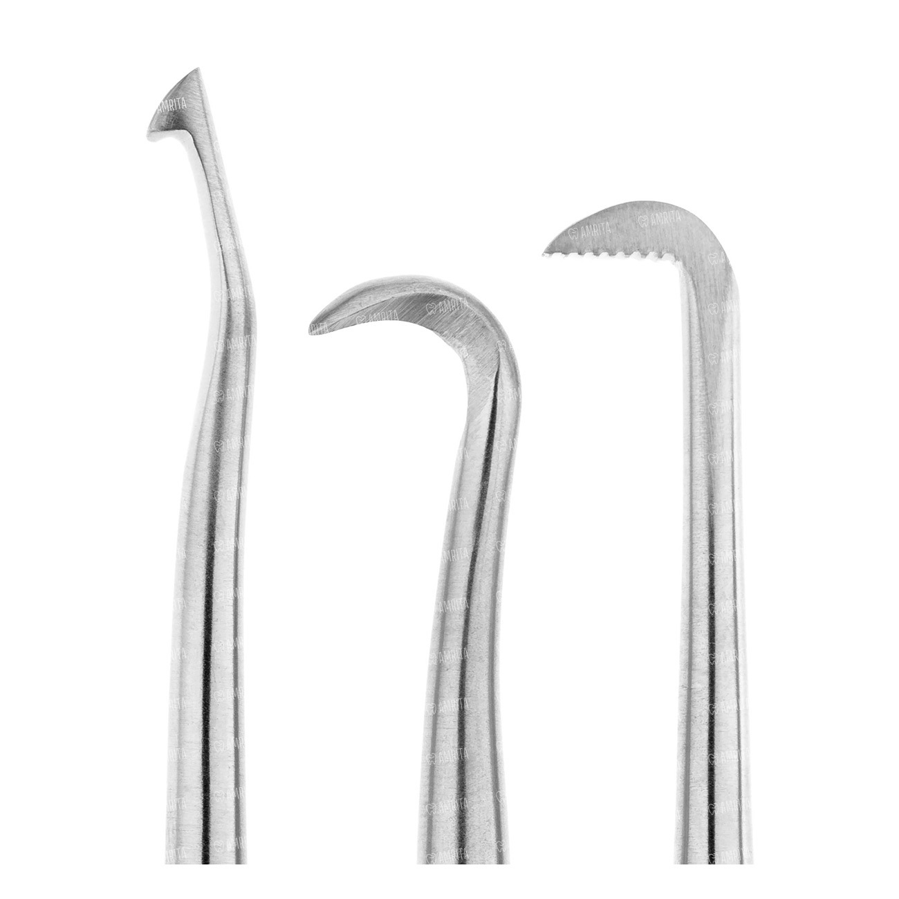В комплект входят три сменные насадки различной формы рабочей части: серповидная, полукруглая с насечками и треугольная. Благодаря отличающимся друг от друга насадкам коронкосниматель можно применять для снятия разных конструкций.