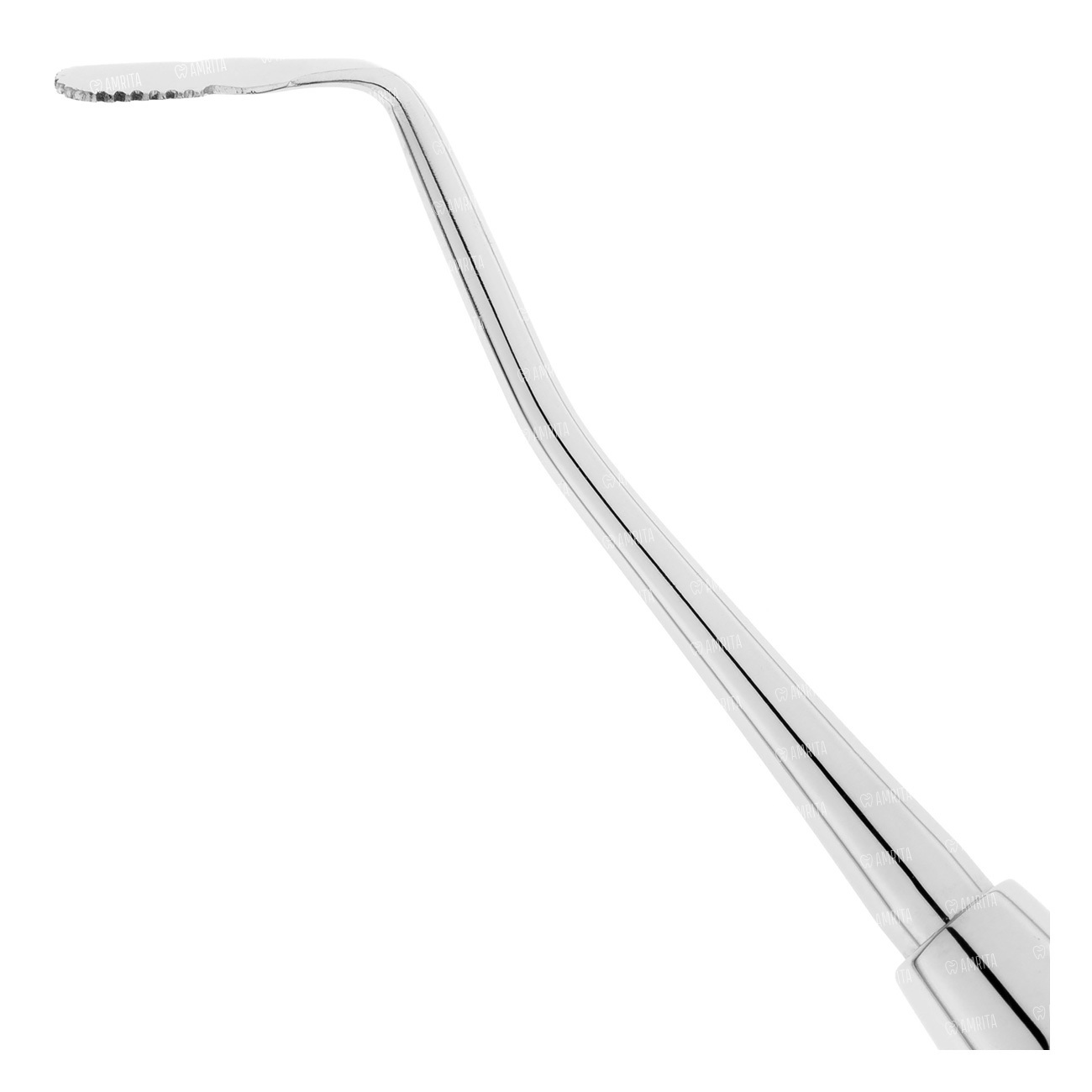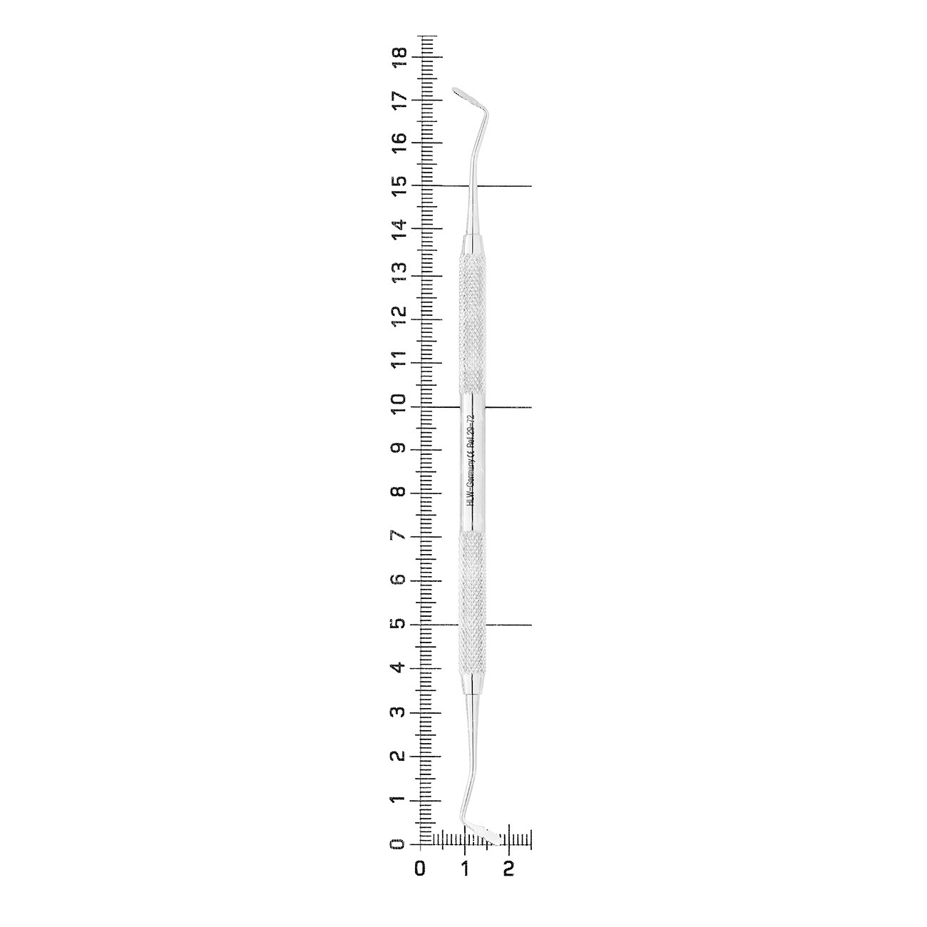 Укладчик ретракционной нити двусторонний зубчатый. Рабочие части имеют зубцы для захвата и проведения манипуляций с ретракционной нитью и имеют двойной изгиб по ребру. Ширина рабочей части не более 2 мм. Ручка круглая диаметром не более 6 мм и покрыта ретенционным узором предотвращающим скольжение инструмента в фалангах пальцев врача при работе.