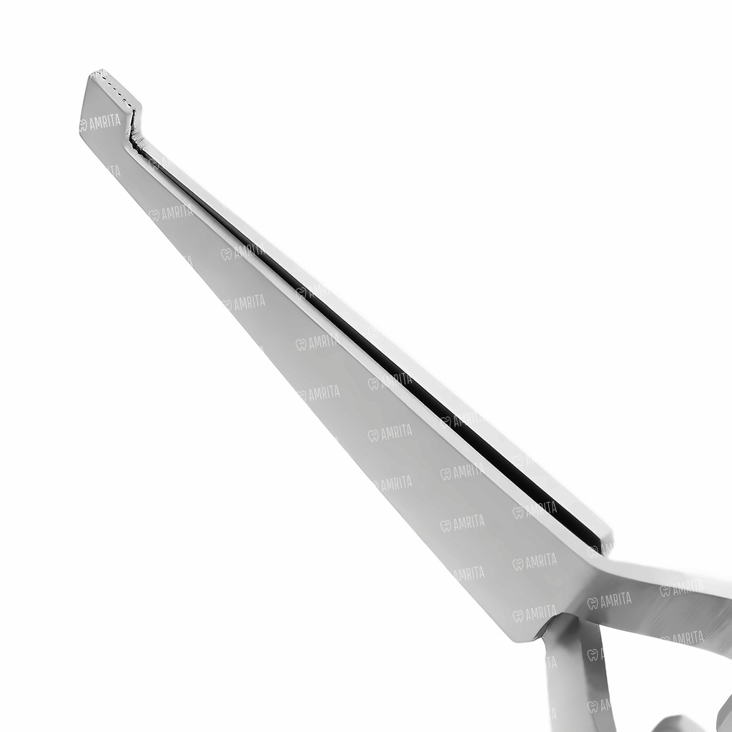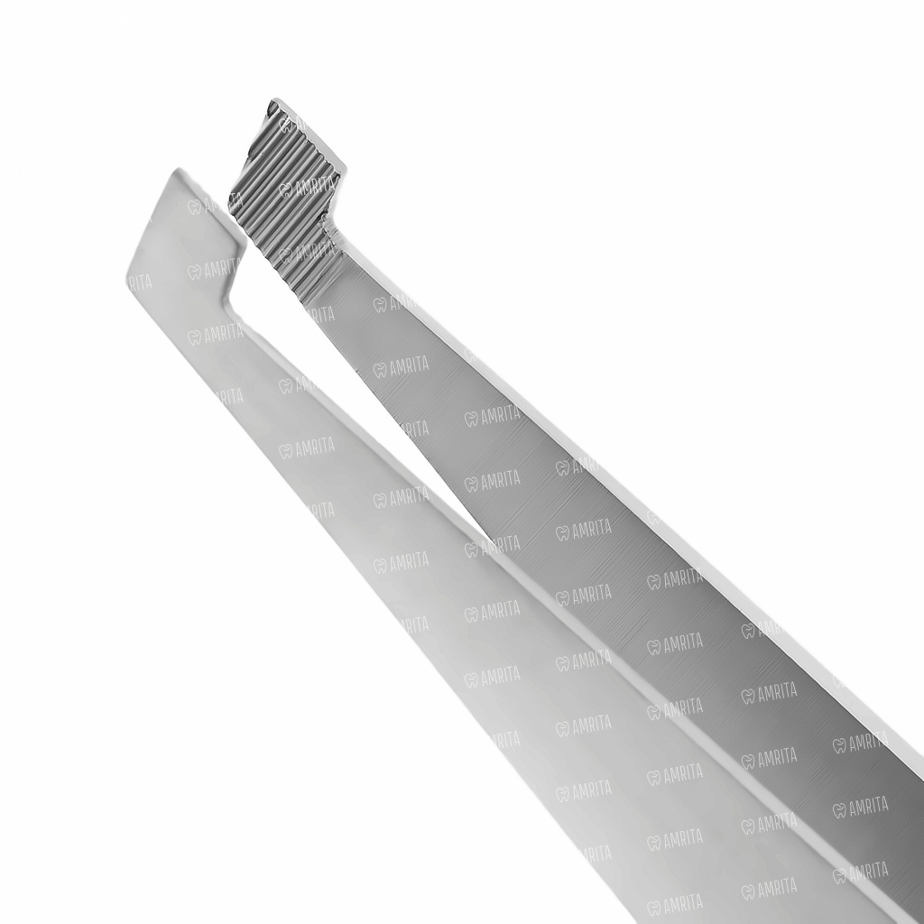 Рабочая часть расположена под тупым углом относительно продольной оси инструмента. Размыкание рабочих частей происходит путем надавливания на центральную часть рукоятки пинцета. Общая длина не более 14 см.