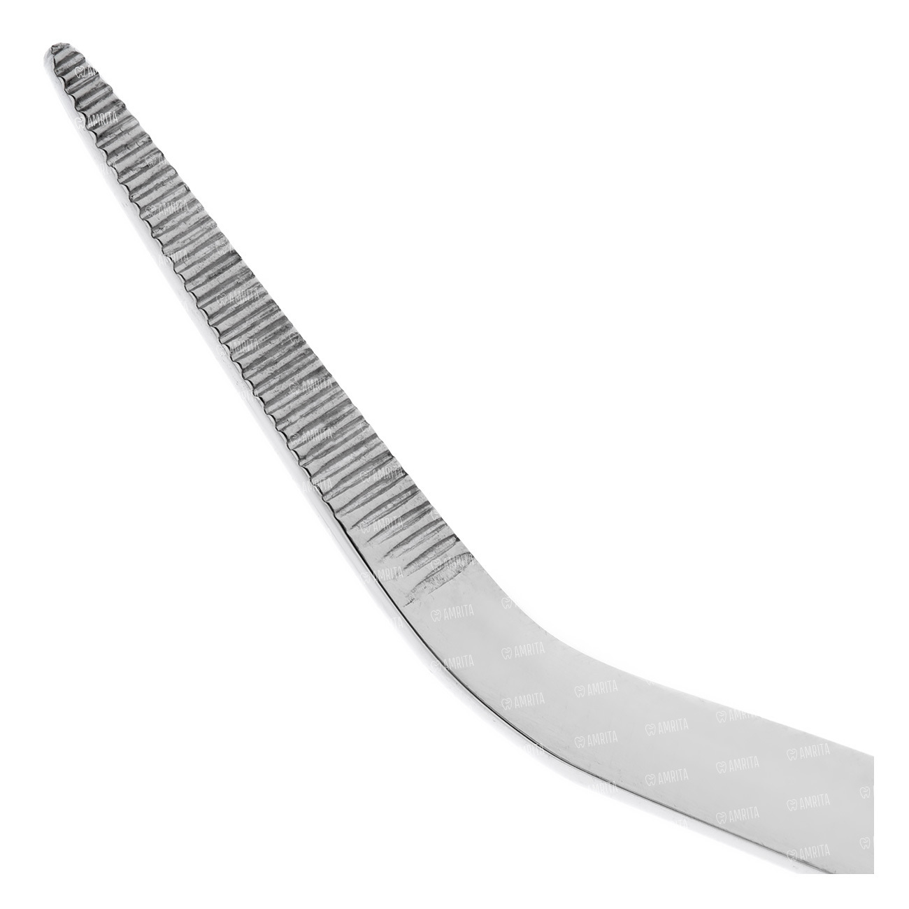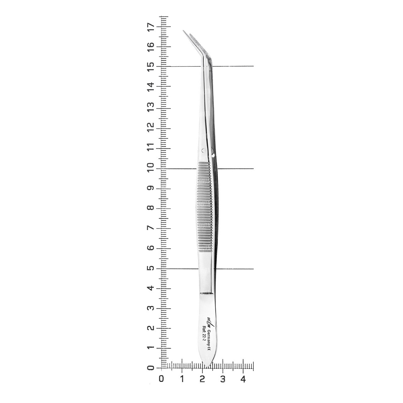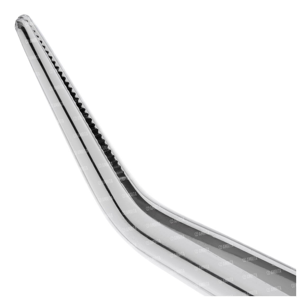 Пинцет анатомический изогнутый. Общая длина не менее 16 см. Внешние поверхности ручек имеют горизонтальные ретенционные насечки, предотвращающие выскальзывание инструмента. Рабочие части изогнуты под тупым углом по плоскости, на внутренней поверхности имеют продольные атравматичные насечки.
