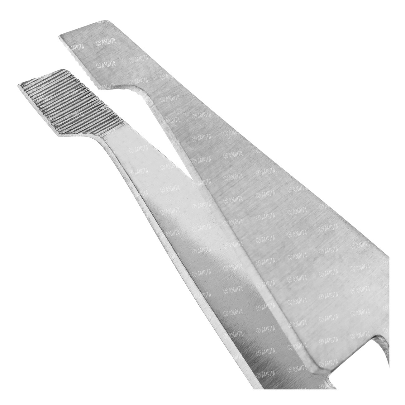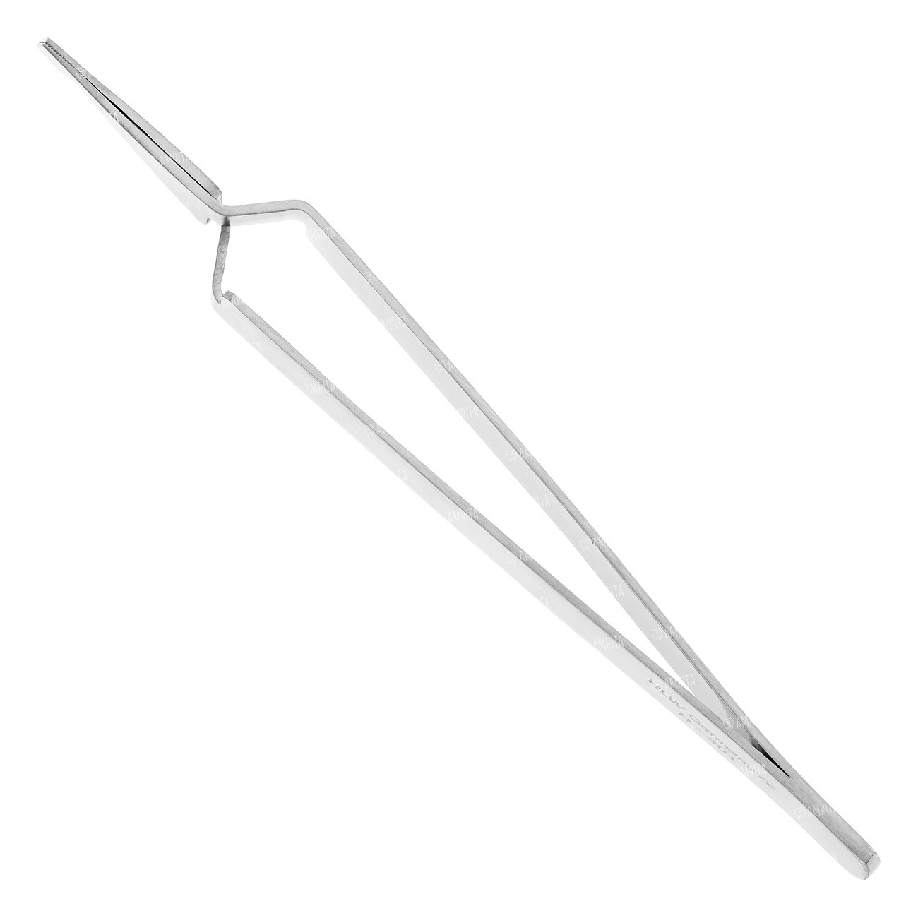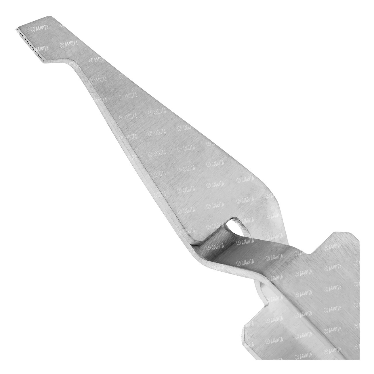 Тыльная сторона пинцета используется для удаления излишков адгезивного и иного материала из области проведения манипуляции Рабочая часть расположена под тупым углом относительно продольной оси инструмента. Размыкание рабочих частей происходит путем надавливания на центральную часть рукоятки пинцета. Общая длина не более 14 см.