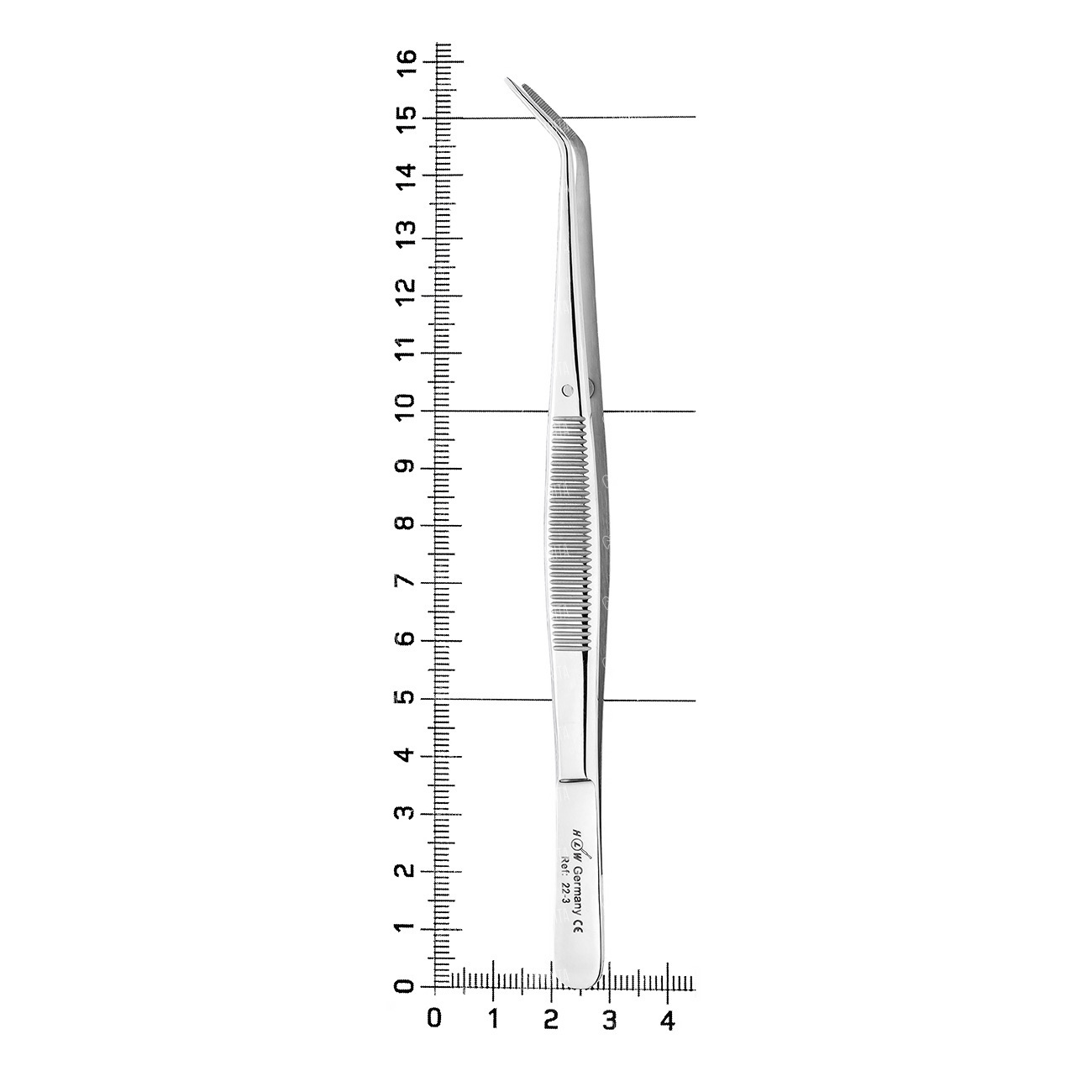 Вид инструмента и конструкция: данный пинцет относится к анатомическим инструментам, предназначенным для максимально деликатного обращения с тканями. Его изогнутая форма рабочей части, изогнутая под тупым углом по плоскости, обеспечивает эргономичный и удобный доступ к анатомическим структурам, расположенным под углом или в труднодоступных областях, улучшая обзор и точность манипуляций. Внешние поверхности ручек имеют горизонтальные ретенционные насечки, предотвращающие выскальзывание инструмента и обеспечивающие уверенную фиксацию в руке.