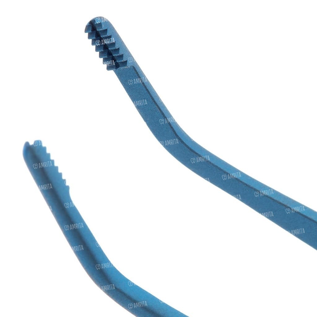 Вид инструмента и конструкция: данный пинцет относится к микрохирургическим инструментам, предназначенным для работы с мельчайшими и чувствительными структурами. Его изогнутая форма обеспечивает оптимальный и эргономичный доступ к анатомическим структурам, расположенным под углом или в труднодоступных областях, улучшая обзор и точность манипуляций. Это позволяет хирургу работать с высокой степенью контроля.