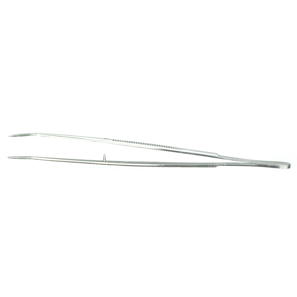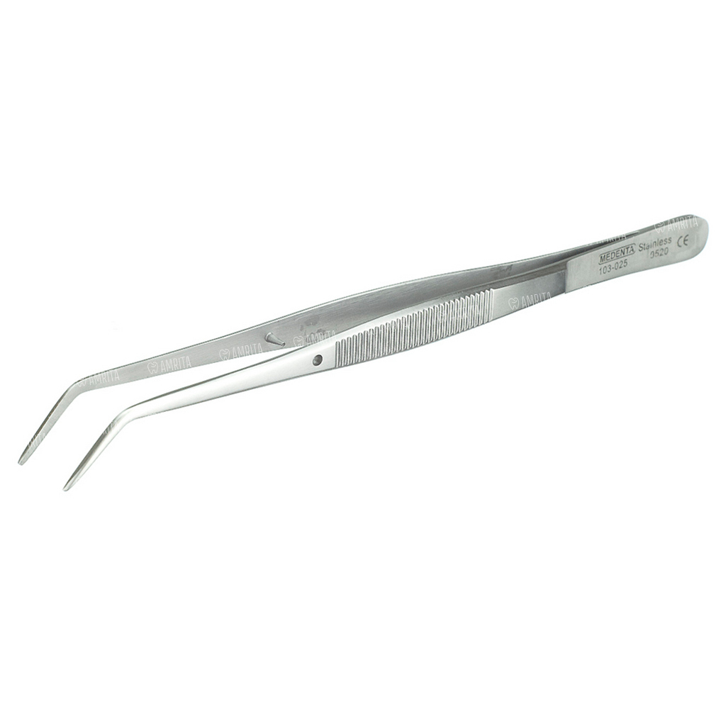Вид инструмента и конструкция: данный пинцет относится к анатомическим инструментам, предназначенным для деликатного обращения с тканями. Его угловая форма рабочей части обеспечивает эргономичный и удобный доступ к анатомическим структурам, расположенным под углом, улучшая обзор и точность манипуляций. Внешние поверхности ручек имеют горизонтальные насечки (ребристую поверхность), что предотвращает выскальзывание инструмента и обеспечивает уверенную фиксацию в руке хирурга.