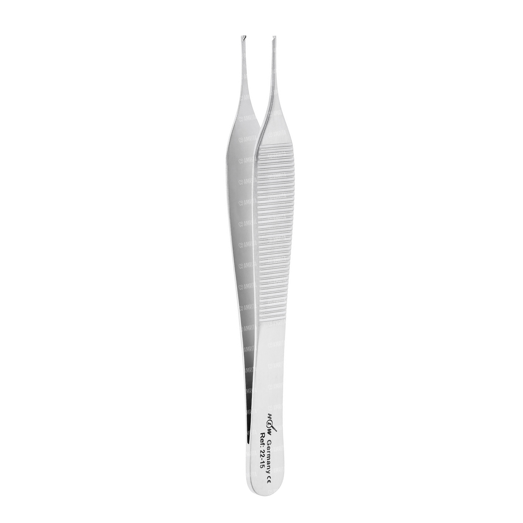 Пинцет хирургический прямой конструкции АДСОНА. Бранши пинцета заканчиваются зубцами, два зубца с одной стороны и один с другой. На наружных поверхностях браншей имеется стандартный ретенционный узор в виде поперечных линий. В области расположения подушечек пальцев бранши расширены. Общая длина инструмента не более 12 см.