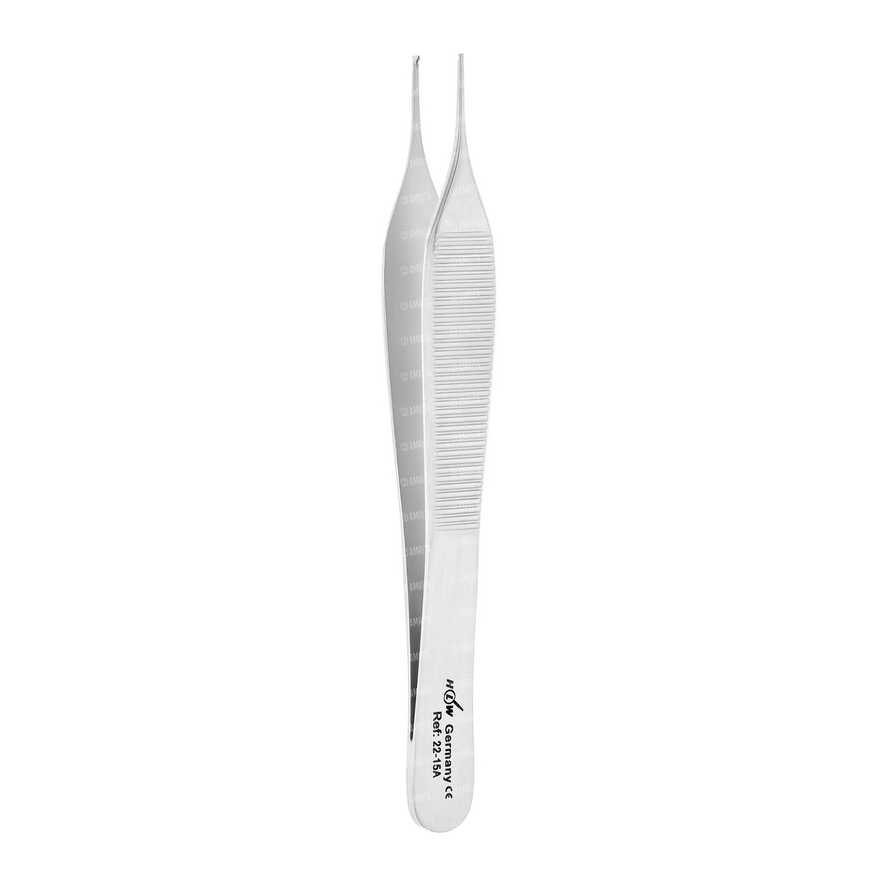 Пинцет микрохирургический прямой конструкции АДСОНА. Бранши пинцета заканчиваются мелкими зубцами, два зубца с одной стороны и один с другой. На наружных поверхностях браншей имеется стандартный ретенционный узор в виде поперечных линий. В области расположения подушечек пальцев бранши расширены. Общая длина инструмента не более 12 см.