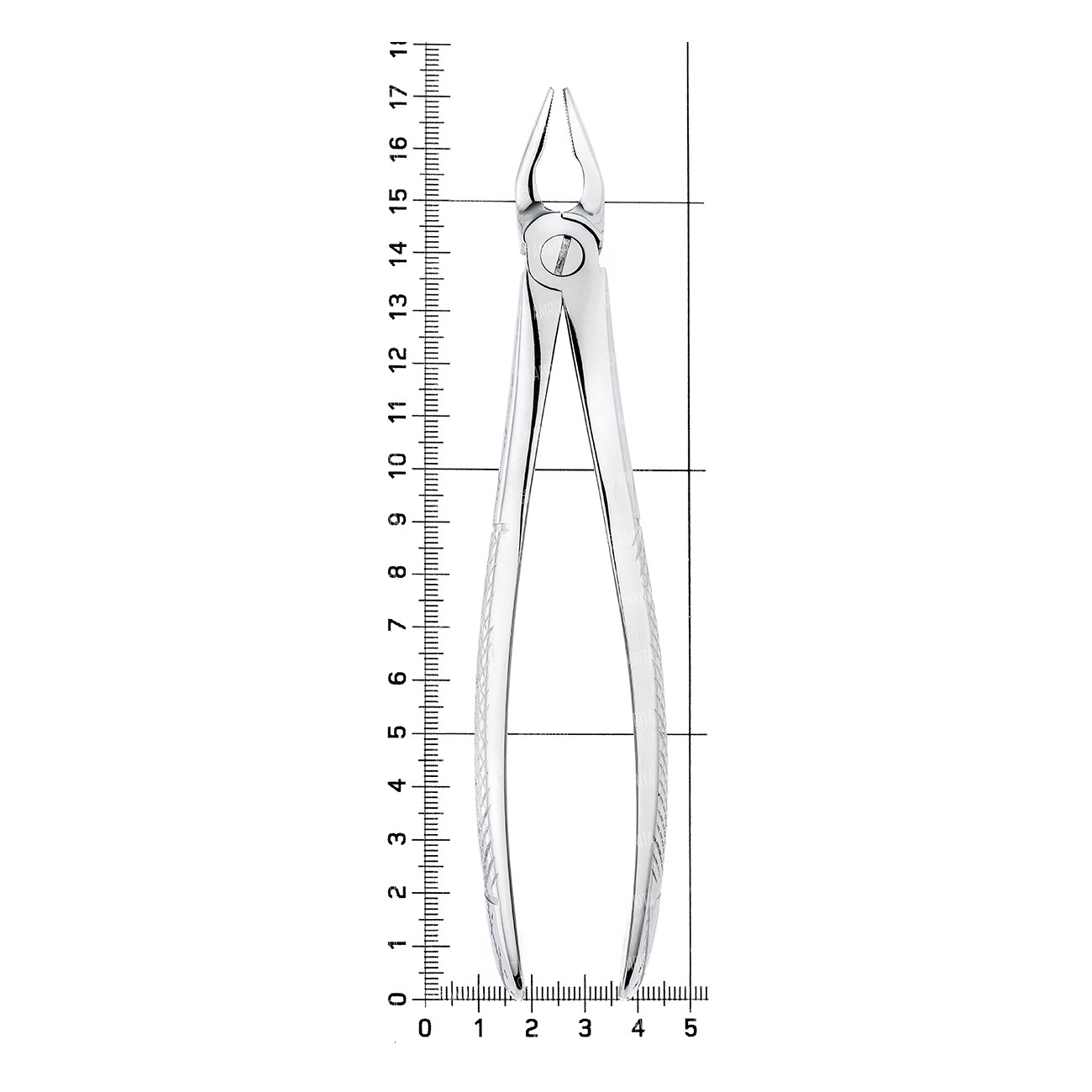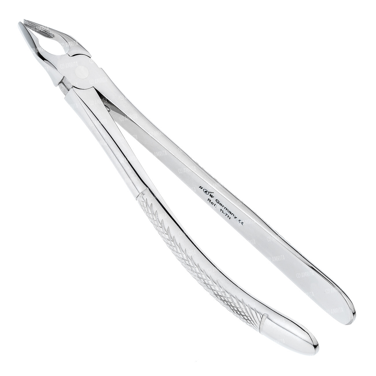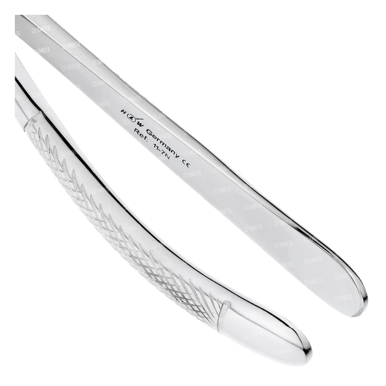 Щипцы с глубоким захватом HLW (Германия) предназначены для удаления премоляров на верхней челюсти с глубоким захватом. Рабочие части инструмента не смыкающиеся, с продольно-поперечными насечками на внутренней поверхности щечек и имеют небольшой изгиб, что позволяет добраться до извлекаемого зуба и плотно обхватить его.