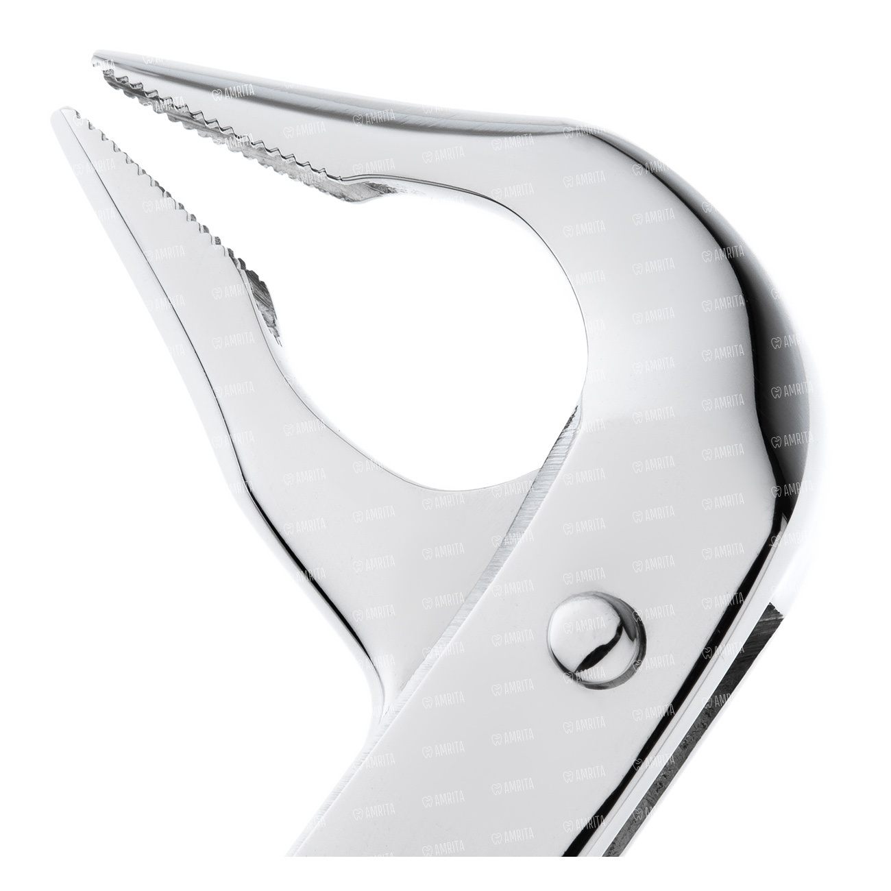 Щечки клювовидного инструмента ориентированы по отношению к ручкам под углом 900, при этом изгиб наносится по ребру. Такая конструкция щипцов облегчает удаление корней на нижней челюсти в труднодоступных участках полости рта.