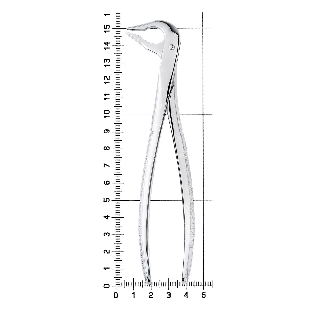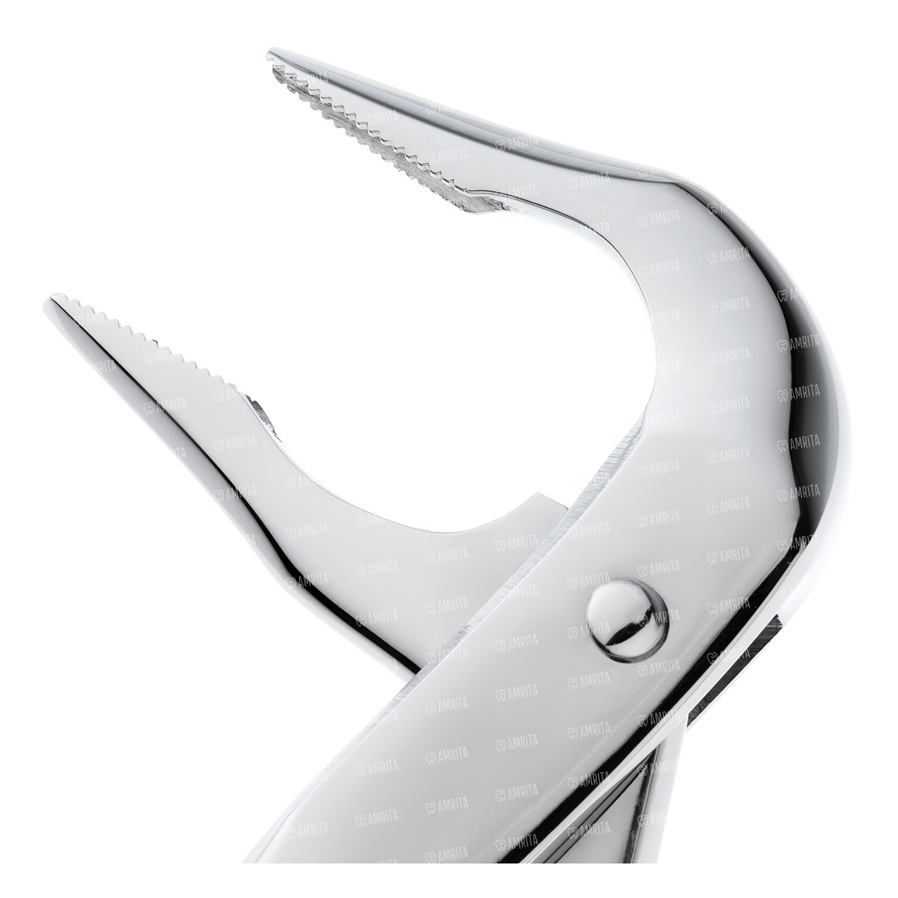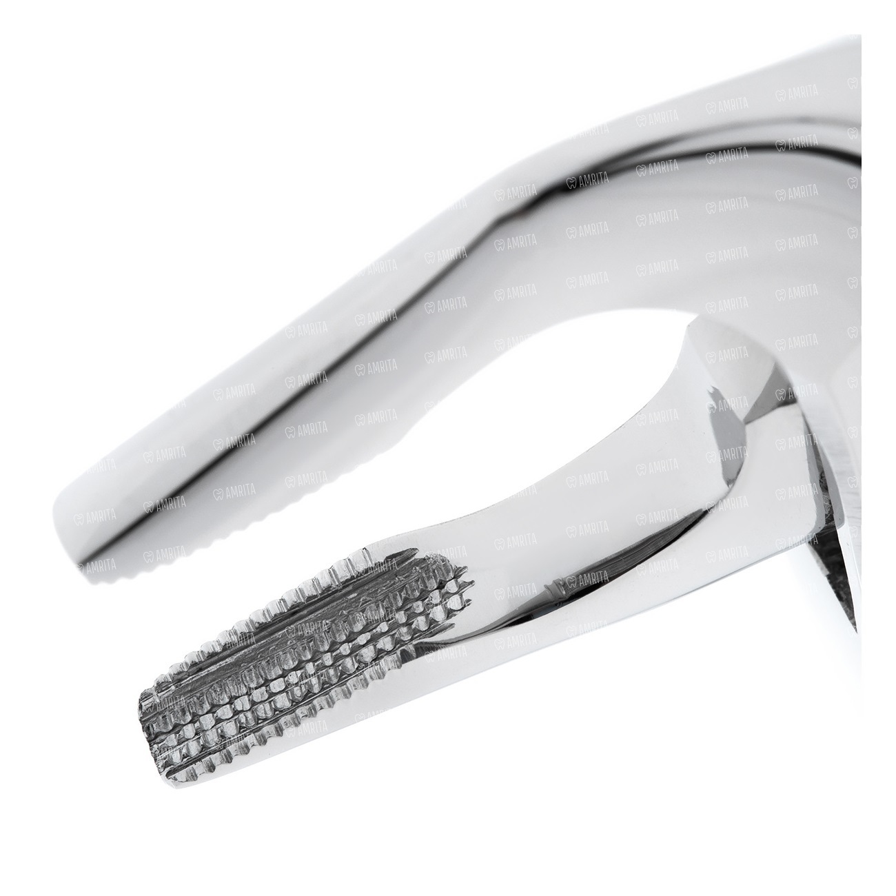 Рабочие части щипцов не сходящиеся, узкие, удлиненные и имеют продольно-поперечные насечки на внутренних поверхностях щечек инструмента, за счет которых осуществляется надежный захват и фиксация щипцов на корне зуба.