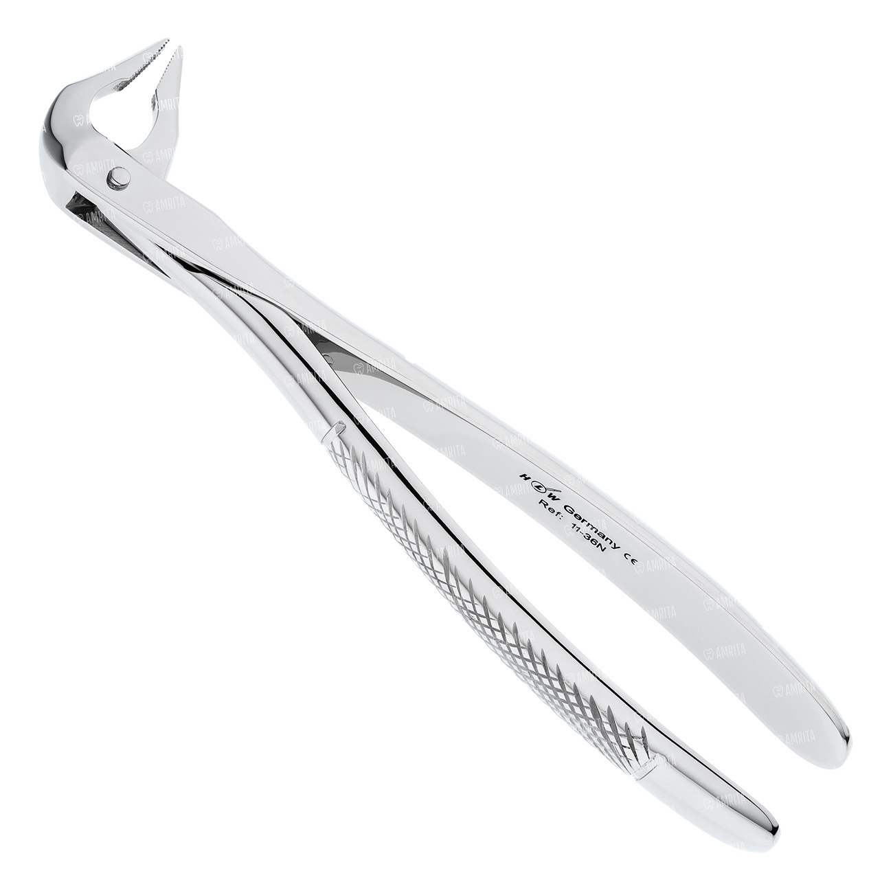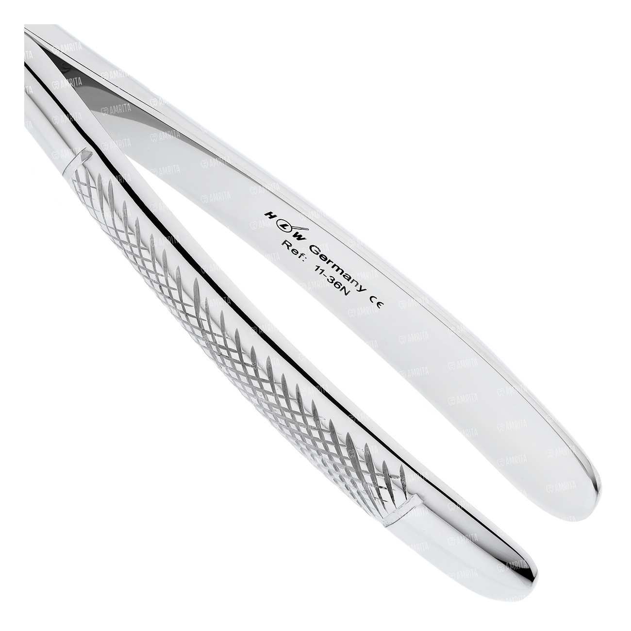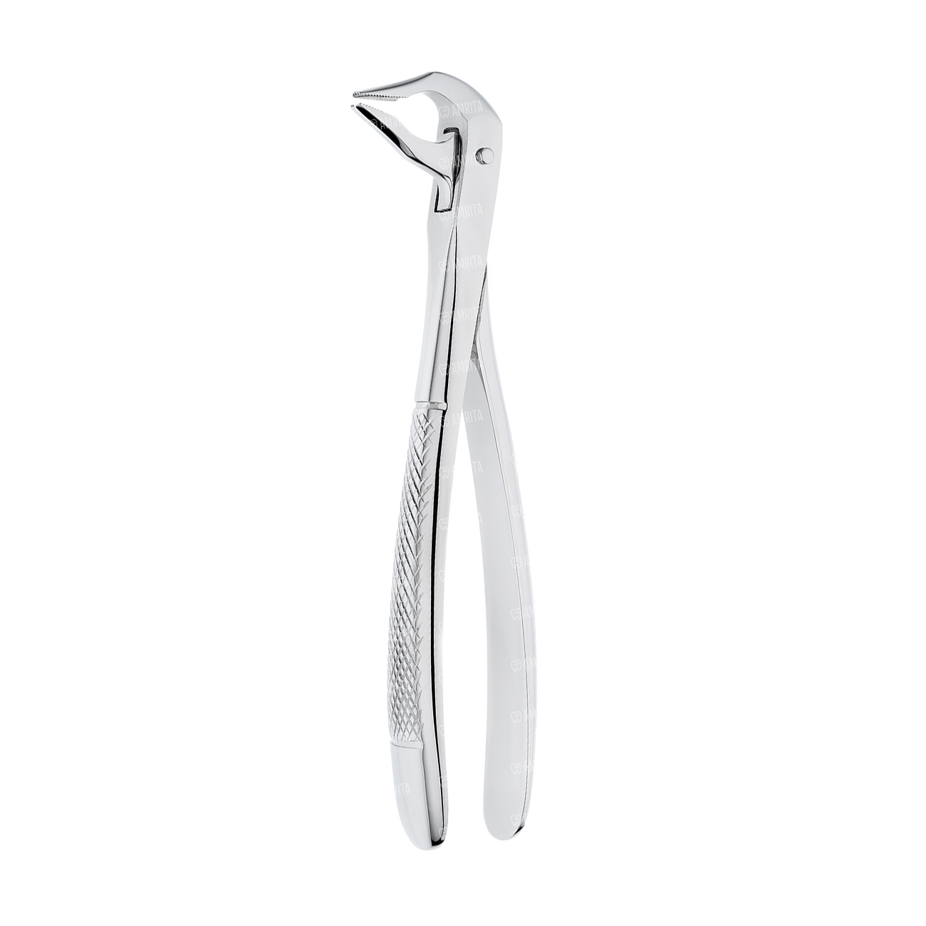 Рабочие части щипцов не сходящиеся, узкие, удлиненные и имеют продольно-поперечные насечки на внутренних поверхностях щечек инструмента, за счет которых осуществляется надежный захват и фиксация щипцов на корне зуба.