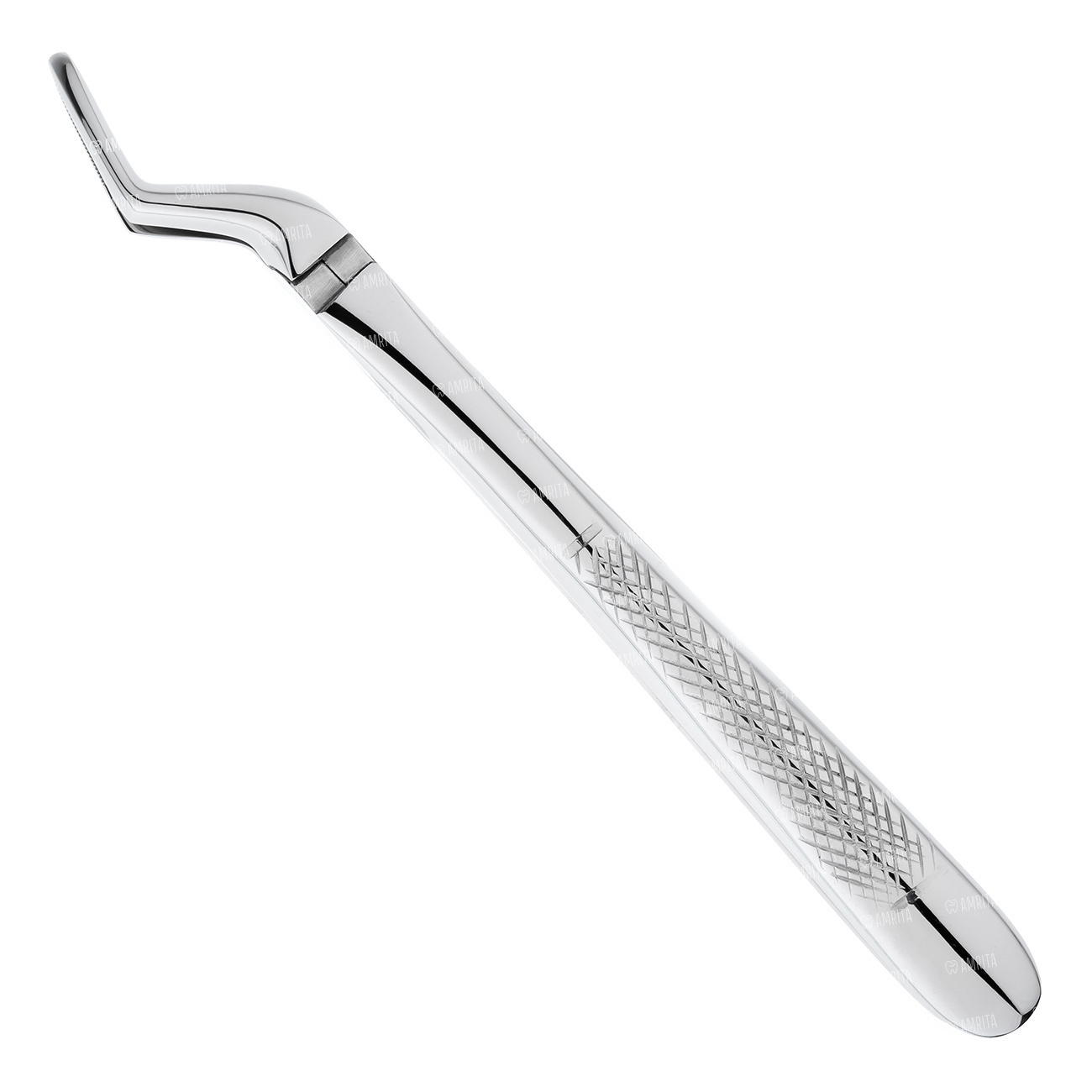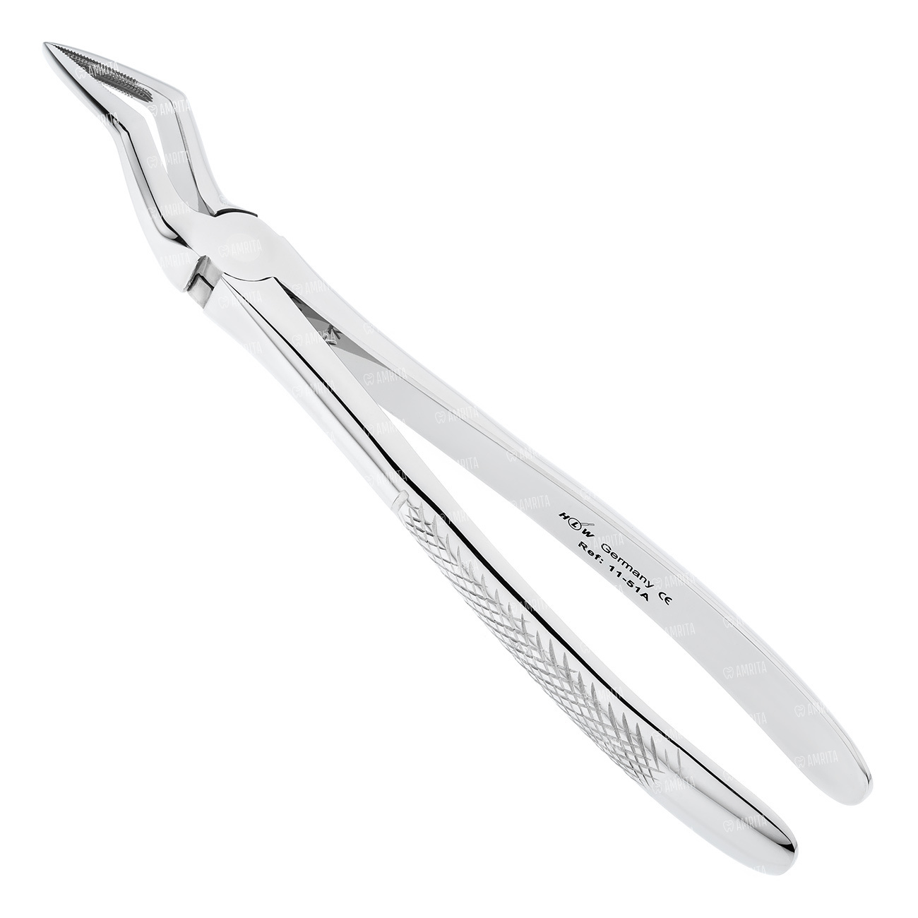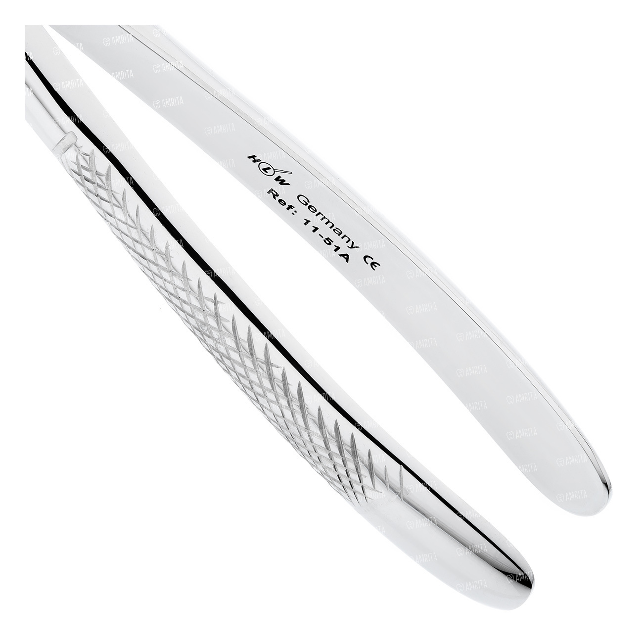 Щипцы для удаления корней на верхней челюсти узкие. Форма №51A. Бранши сходящиеся на конце. Рабочая часть имеет штыковидный (байонетный) изгиб. Внутренняя поверхность рабочей части имеет поперечно-продольные насечки. Наружная поверхность ручек покрыта ретенционным узором предотвращающим скольжение фаланг пальцев в латексной перчатке. Отполированы до зеркального блеска. В основании шарнирного соединения имеется тефлоновая вставка обеспечивающая плавный ход инструмента. Мартенситная сталь DIN 1.4034, X40Cr13 (ГОСТ 40X13). Твердость по Роквеллу 50-54 RW.