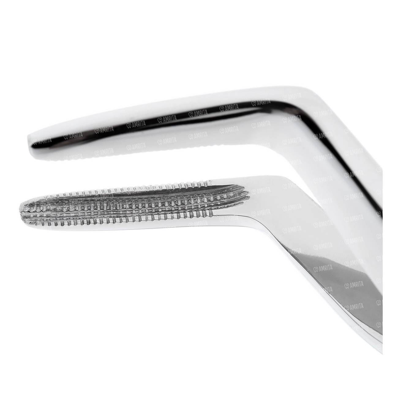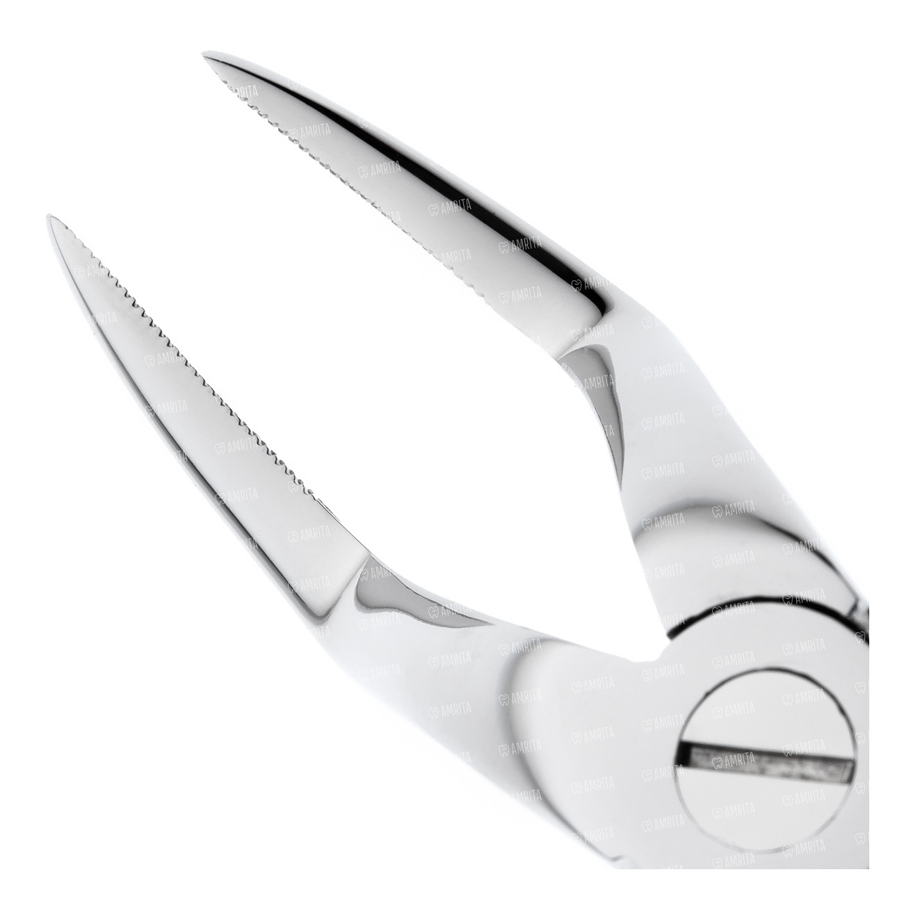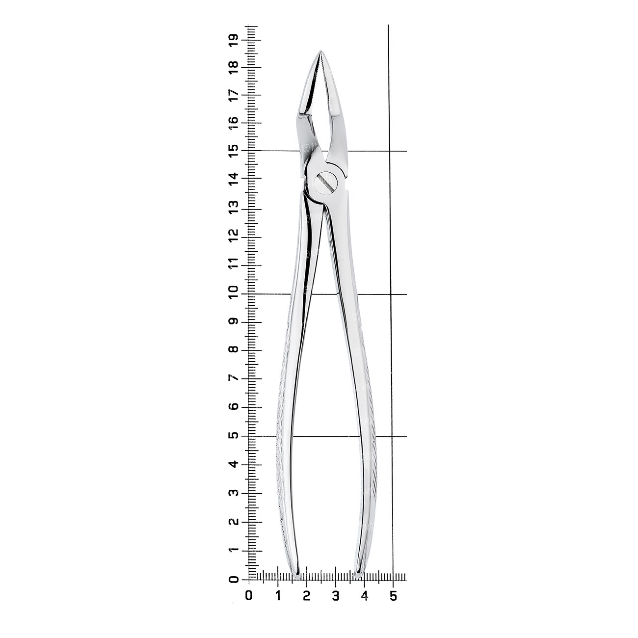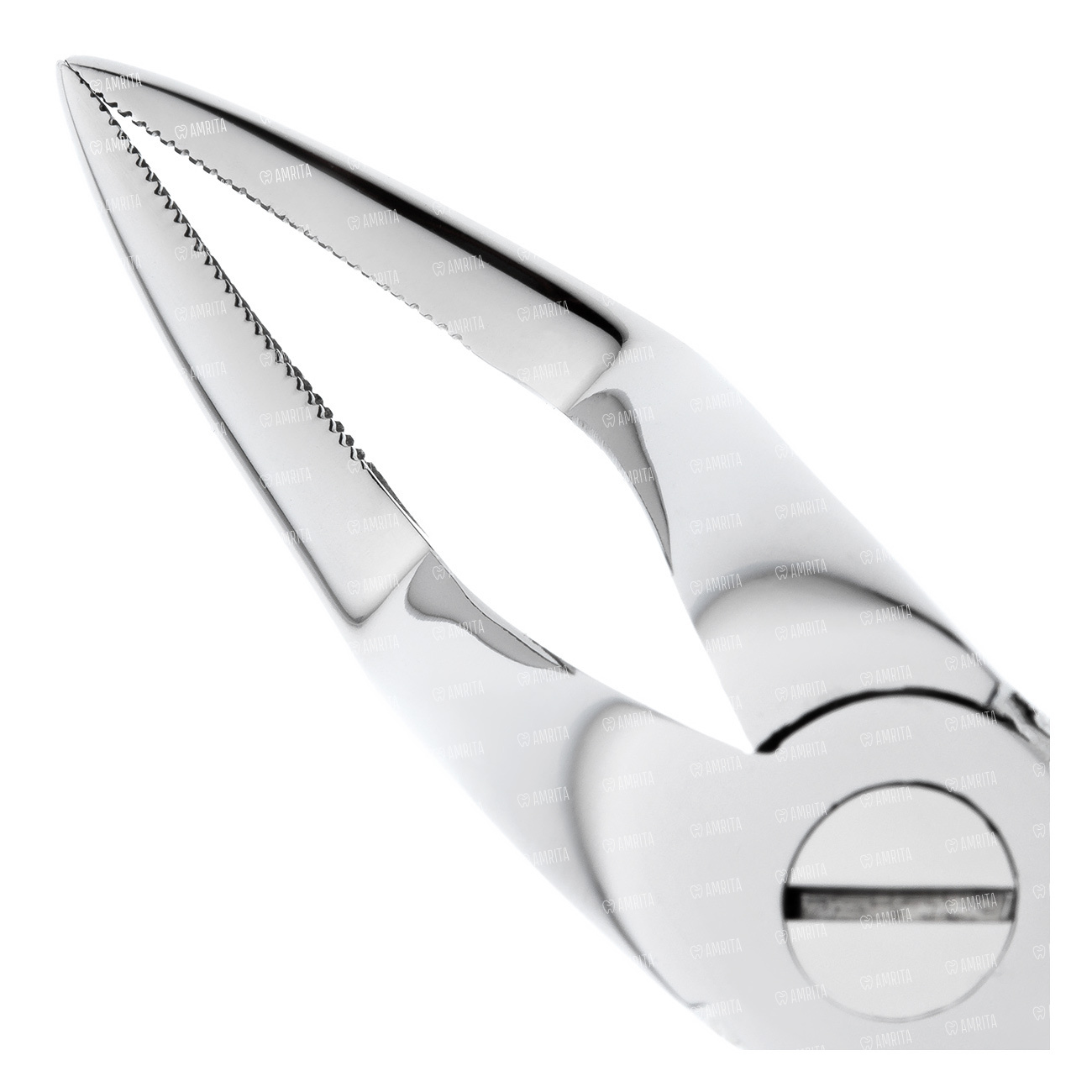 Щипцы для удаления корней на верхней челюсти узкие. Форма №51A. Бранши сходящиеся на конце. Рабочая часть имеет штыковидный (байонетный) изгиб. Внутренняя поверхность рабочей части имеет поперечно-продольные насечки. Наружная поверхность ручек покрыта ретенционным узором предотвращающим скольжение фаланг пальцев в латексной перчатке. Отполированы до зеркального блеска. В основании шарнирного соединения имеется тефлоновая вставка обеспечивающая плавный ход инструмента. Мартенситная сталь DIN 1.4034, X40Cr13 (ГОСТ 40X13). Твердость по Роквеллу 50-54 RW.