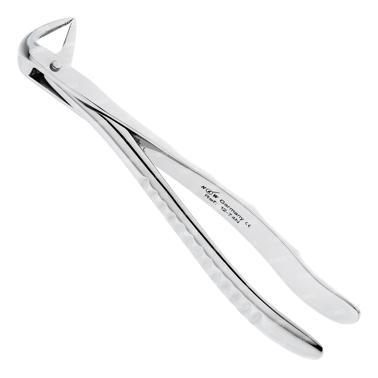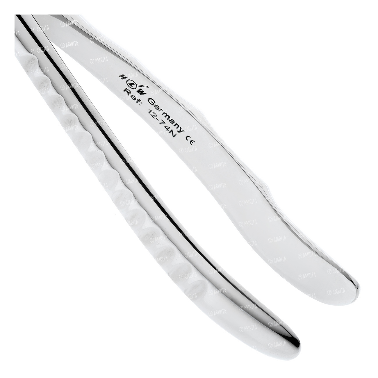 Щипцы для удаления корней зубов на нижней челюсти клювовидные узкие. Форма №74. Щипцы имеют изгиб по ребру. Бранши сходящиеся, зауженные.