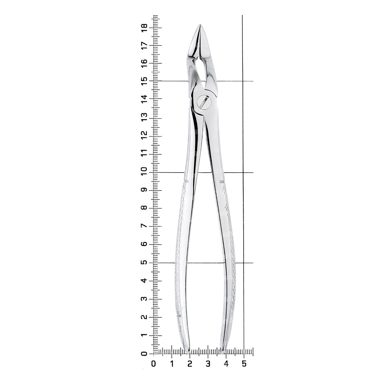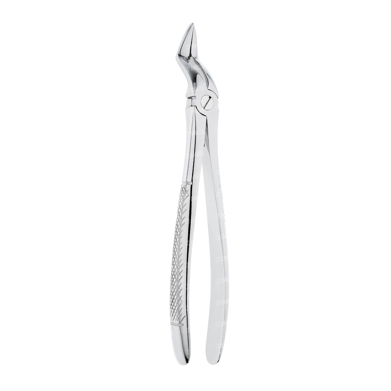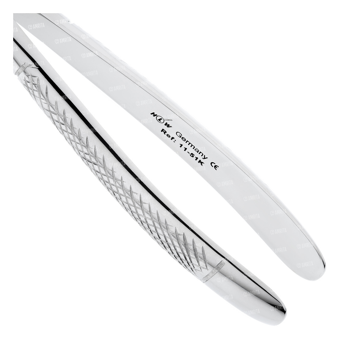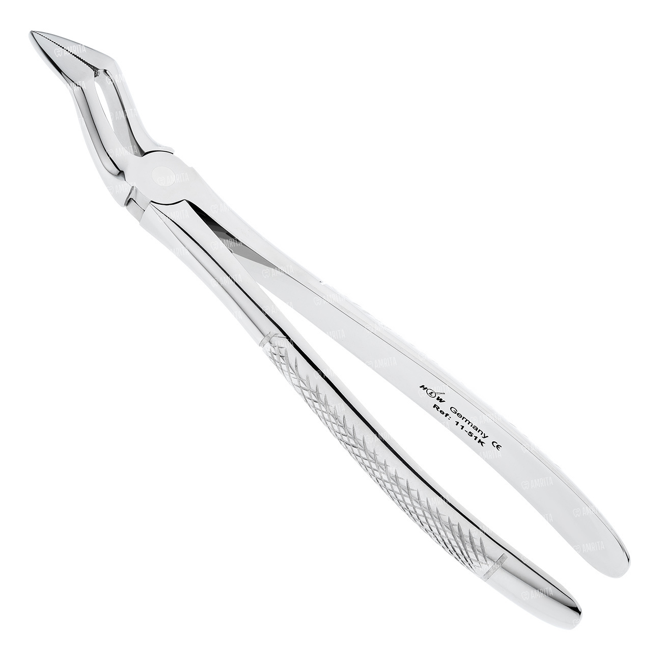 Щипцы для удаления корней на верхней челюсти укороченные. Форма №51K. Бранши сходящиеся на конце. Рабочая часть имеет штыковидный (байонетный) изгиб.