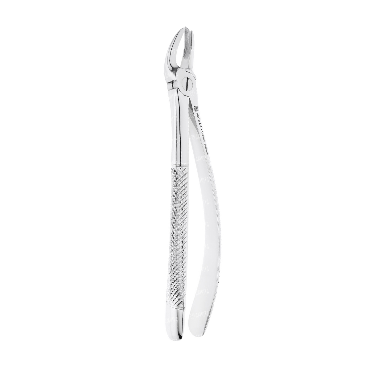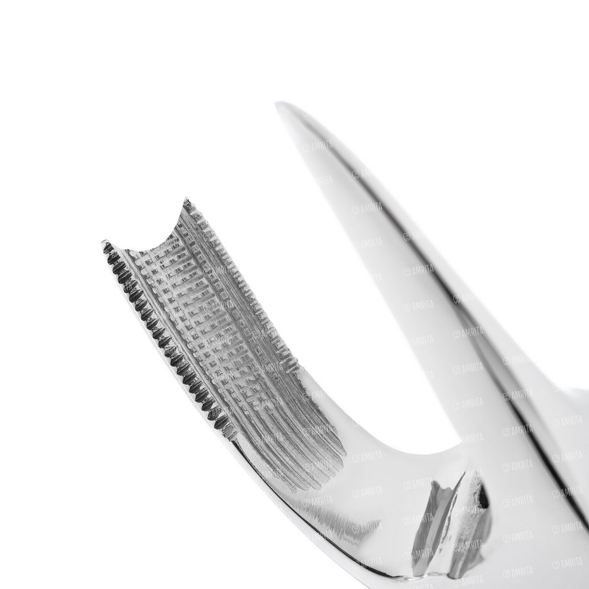 Гладкие не сходящиеся рабочие части инструмента в форме вытянутого, острого треугольника имеют вогнутость по форме зуба. Такая конструкция позволяет надежно зафиксировать инструмент на правом моляре и облегчает процесс его удаления. S-образный изгиб инструмента обеспечивает комфортную работу в дистальном отделе верхней челюсти.