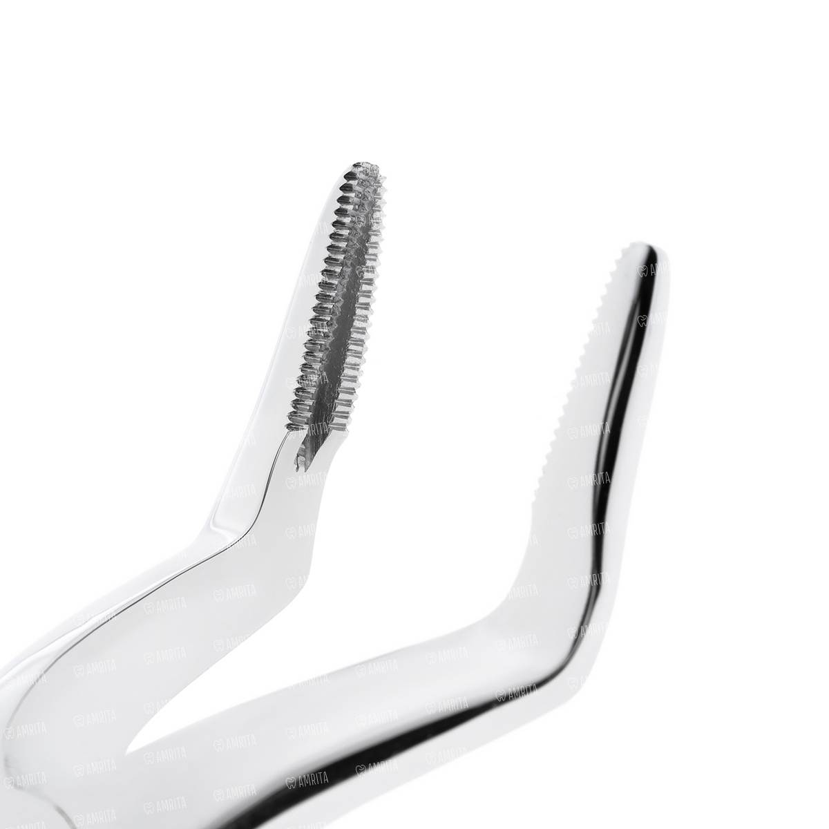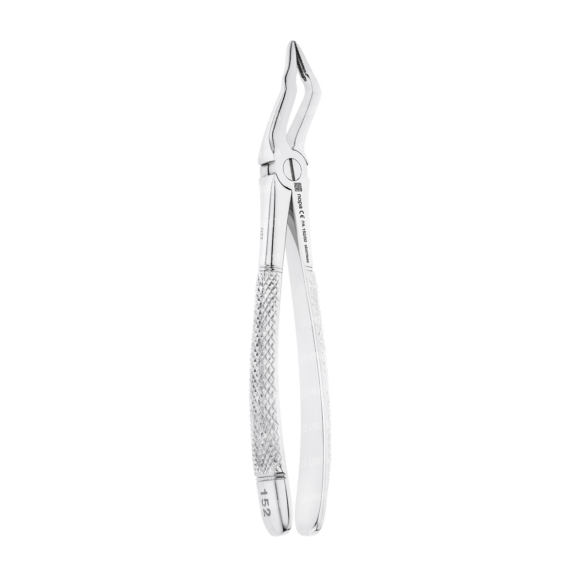 Щипцы формы №152 используются для удаления корней на верхней челюсти. Байонетная рабочая часть щипцов имеет узкую и длинную форму, сходящиеся на конце щечки, а также продольно-поперечные насечки на внутренней поверхности. Такая конструкция инструмента облегчает доступ к корням зубов при работе в любом квадранте верхней челюсти.