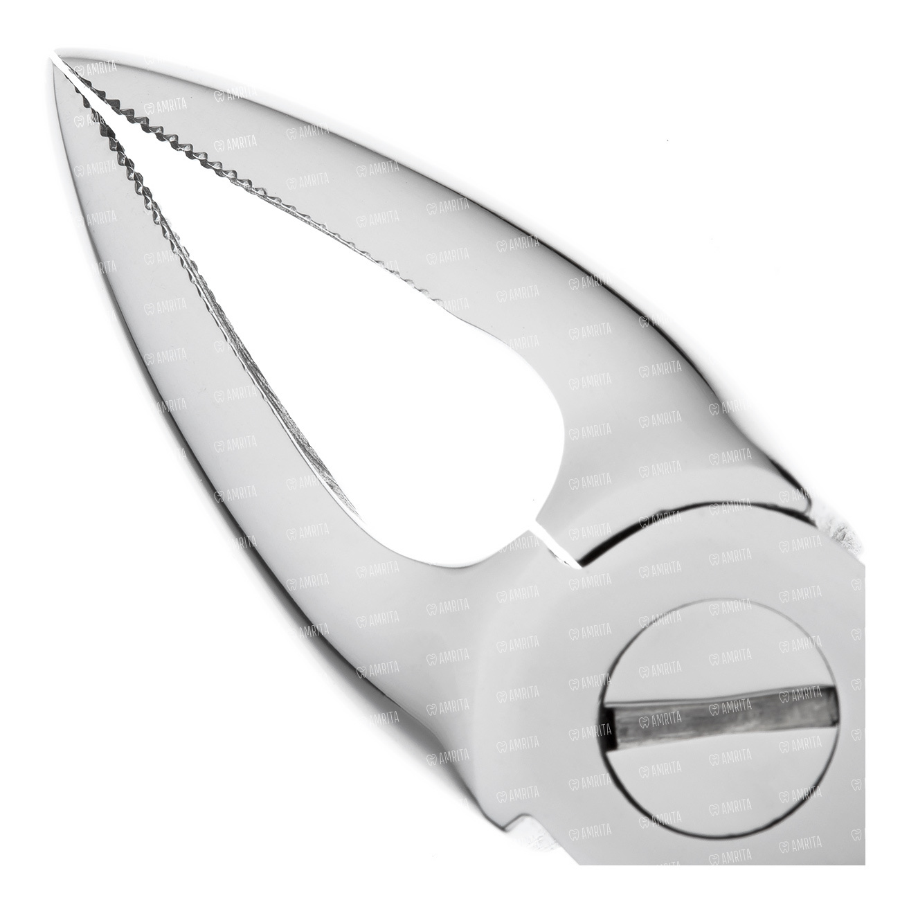 Внутренняя поверхность рабочей части имеет поперечно-продольные насечки. Поверхность одной из ручек имеет эргономически удобные анатомичные изгибы для фаланг пальцев, вторая ручка гладкая. Отполированы до зеркального блеска. В основании шарнирного соединения имеется тефлоновая вставка обеспечивающая плавный ход инструмента.