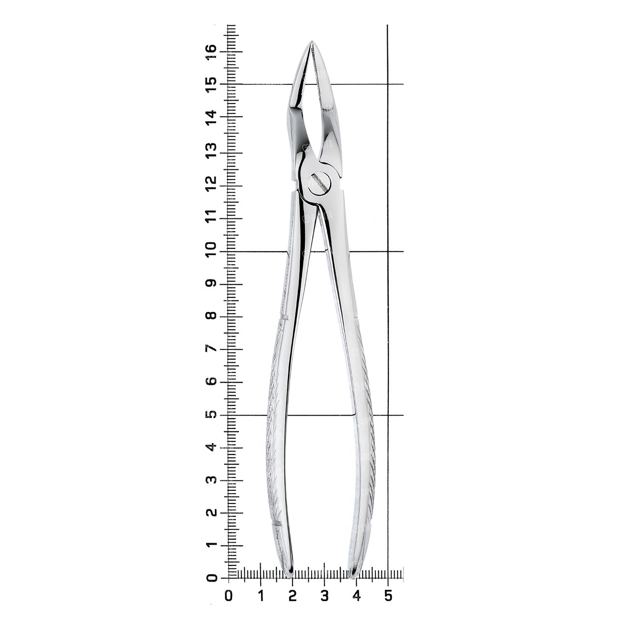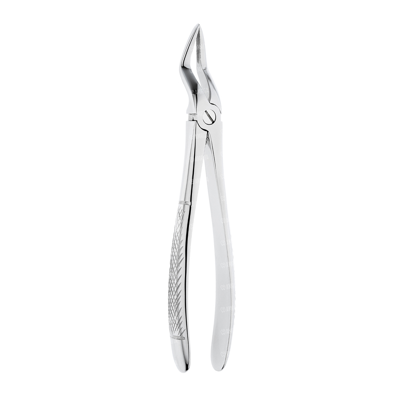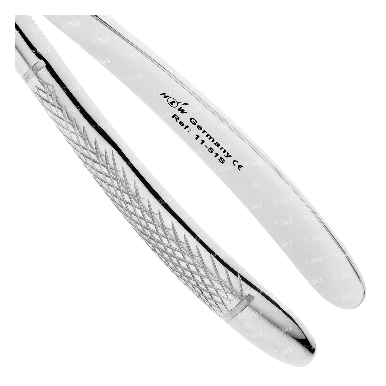 Щипцы для удаления корней молочных зубов на верхней челюсти узкие детские. Форма №51S. Бранши полностью сходящиеся удлиненные. Рабочая часть имеет штыковидный (байонетный) изгиб. Внутренняя поверхность рабочей части имеет поперечно-продольные насечки.
