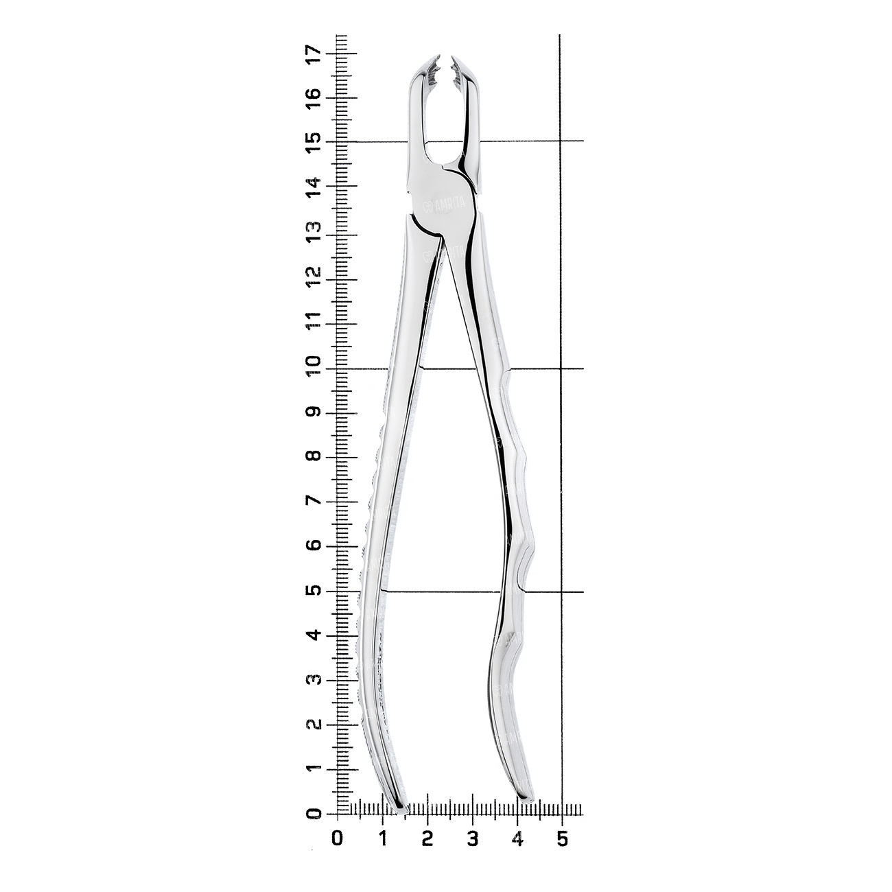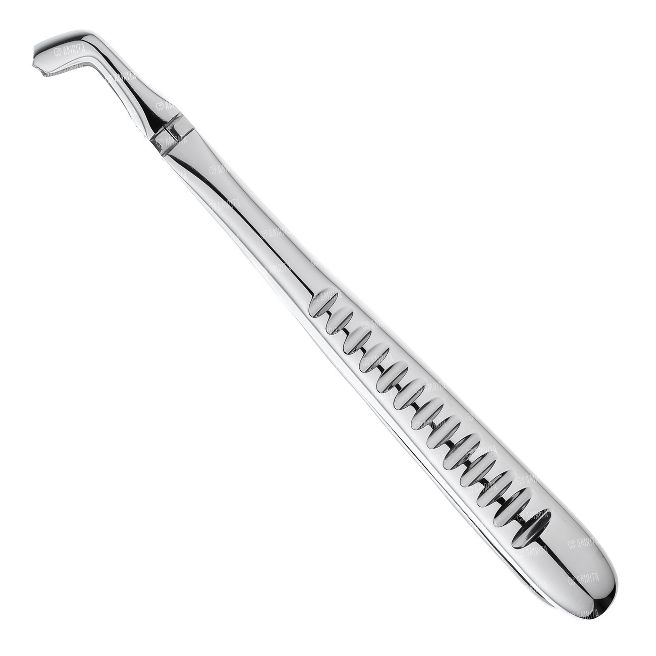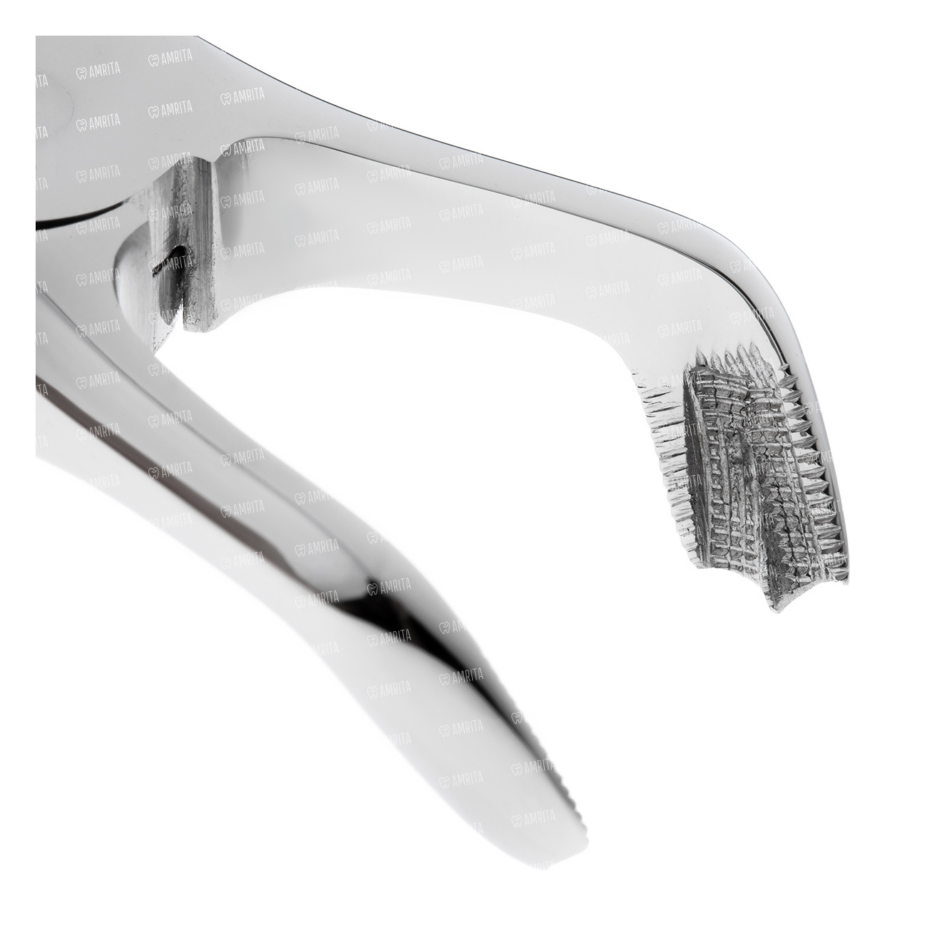 Щипцы имеют изгиб по плоскости под тупым углом к продольной оси инструмента, благодаря чему есть возможность ввести щипцы глубоко в полость рта.