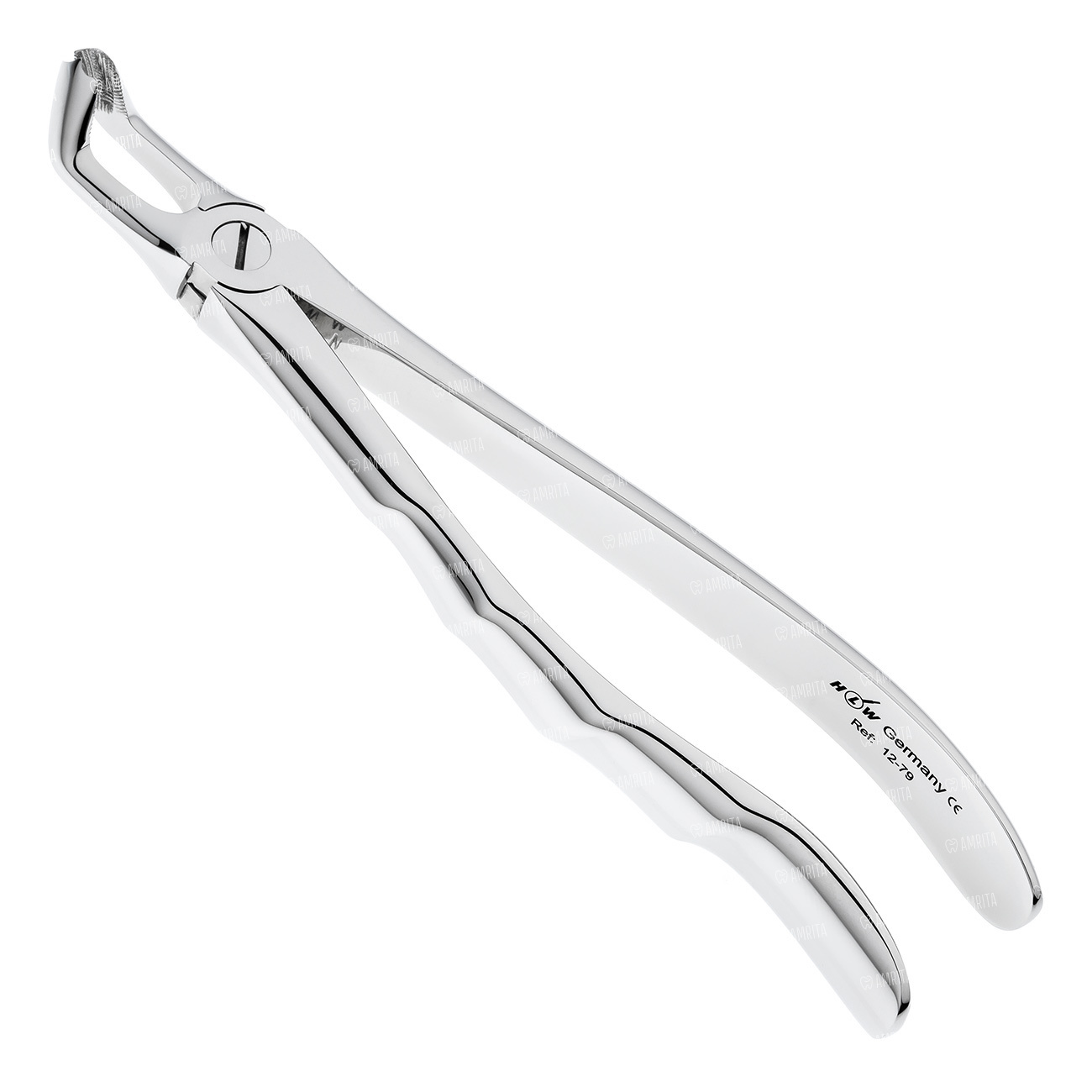 Щипцы для удаления зубов нижние, для третьих моляров, анатомическая ручка, HLW (Германия). Рабочие части вертикально-изогнутого инструмента не сходящиеся. На внутренней поверхности щечек щипцов расположены шипы и продольно-поперечные насечки. Такая форма позволяет правильно наложить и зафиксировать инструмент на удаляемом зубе мудрости.