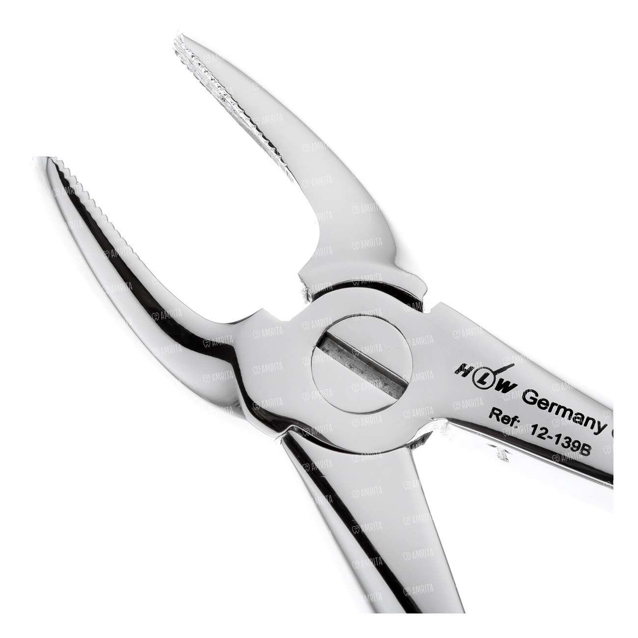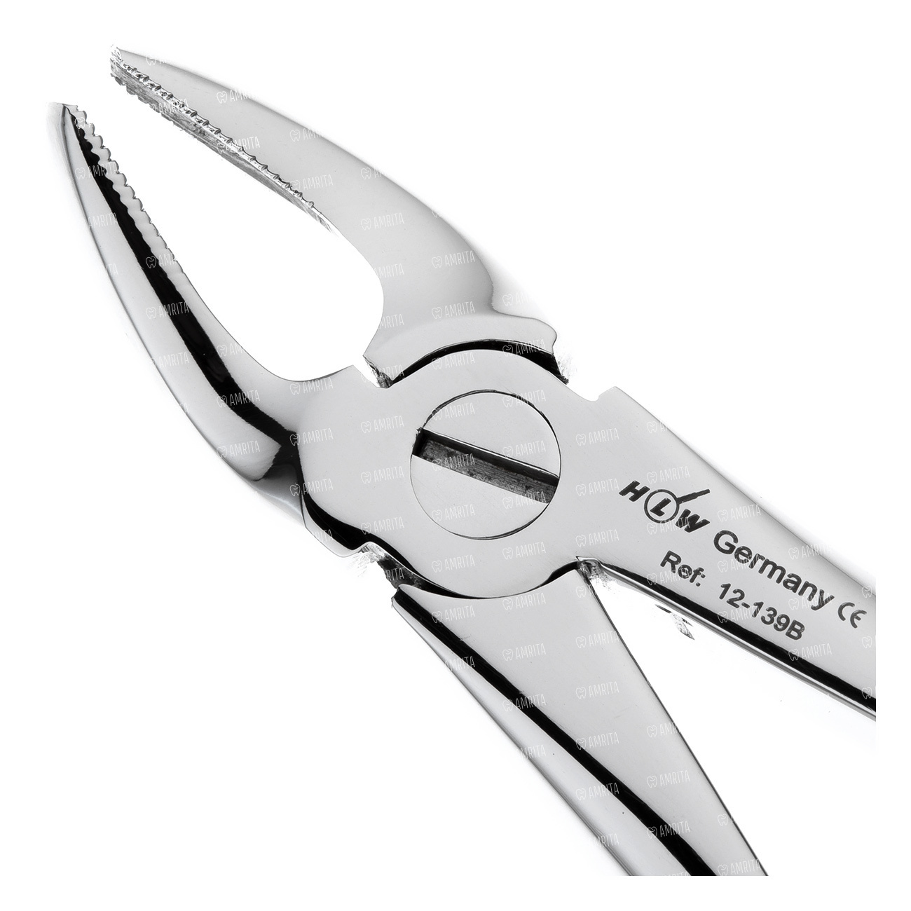 Щипцы HLW (Германия) предназначены для удаления молочных премоляров верхней челюсти у детей. Рабочие части инструмента укороченные, сходящиеся. Внутренняя поверхность щипцов имеет продольно-поперечные насечки, улучшающие захват фрагмента корня.