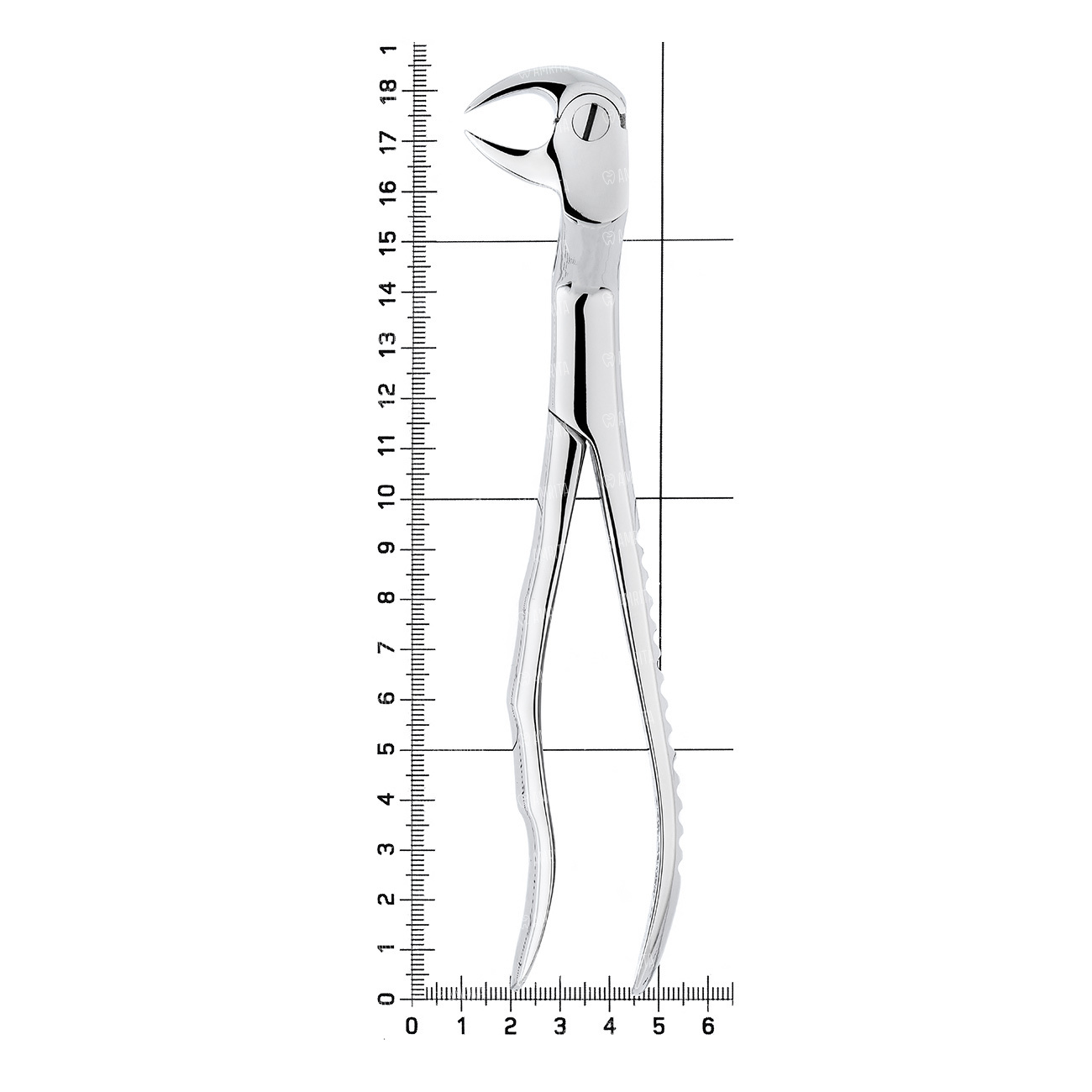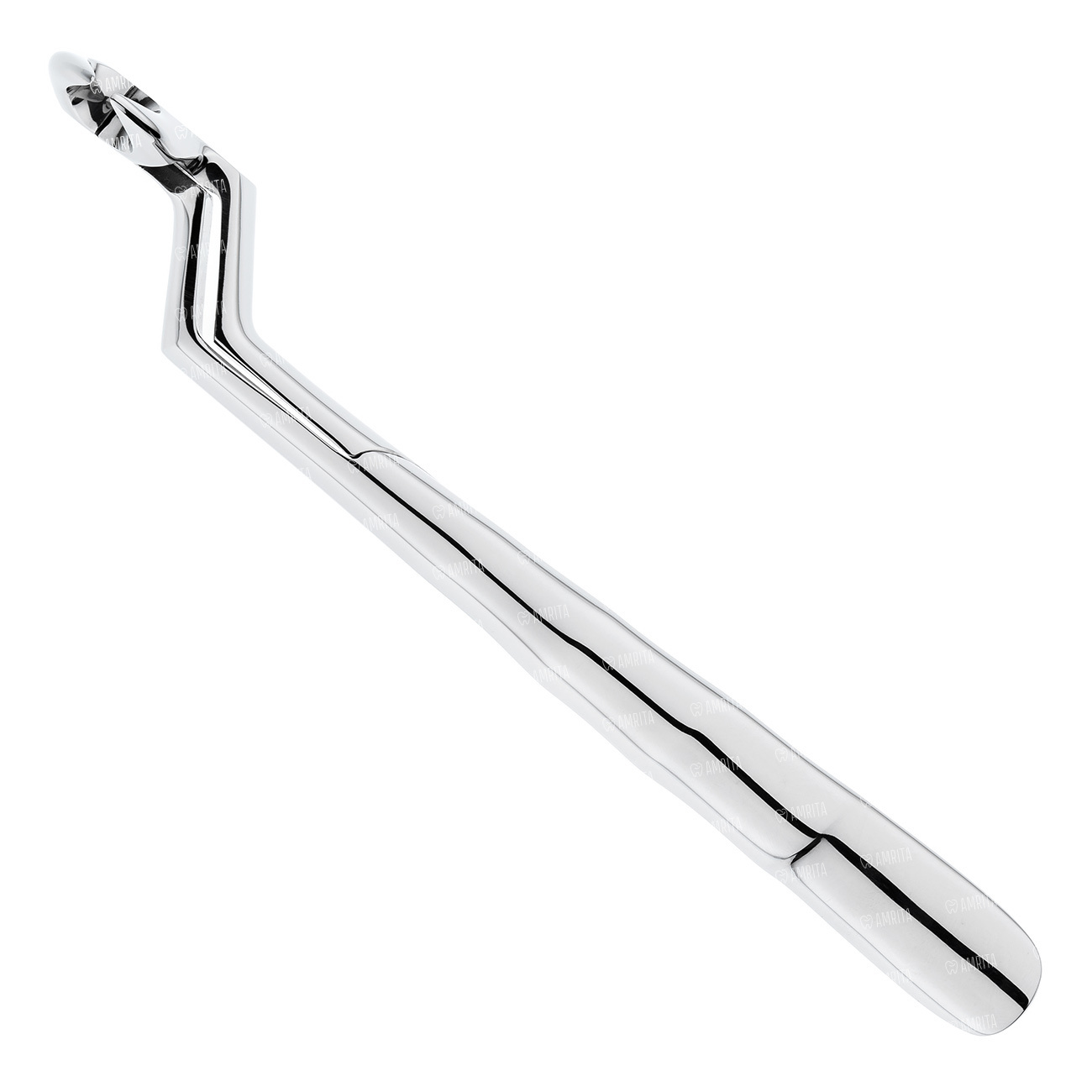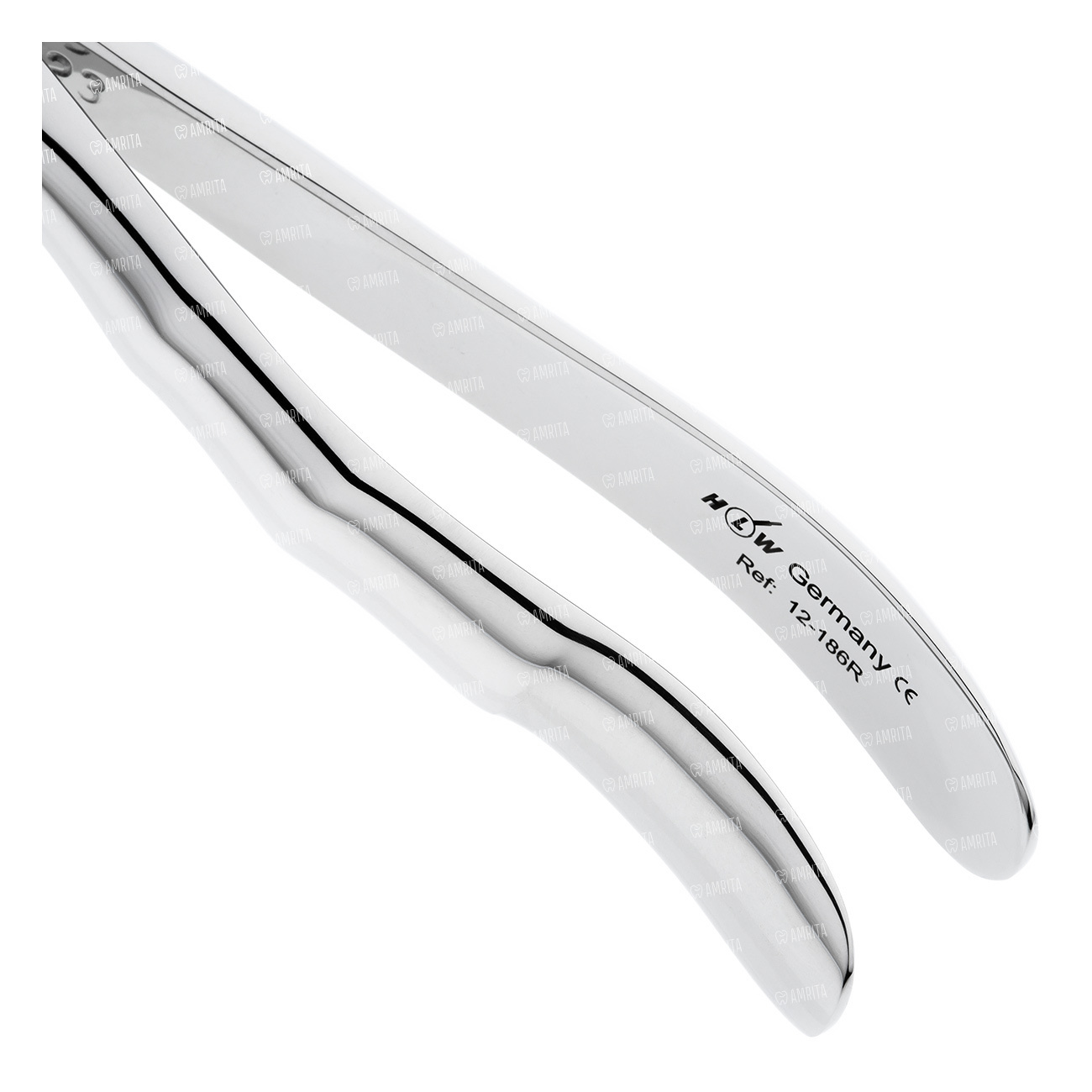 Щипцы для удаления третьих моляров на нижней челюсти справа. Форма №186R. Щипцы имеют одиночный изгиб по принципу байонета. Бранши не сходящиеся симметричные, имеют пирамидальную форму с острой вершиной, повернуты под углом в 90 градусов к продольной оси инструмента в форме клюва.