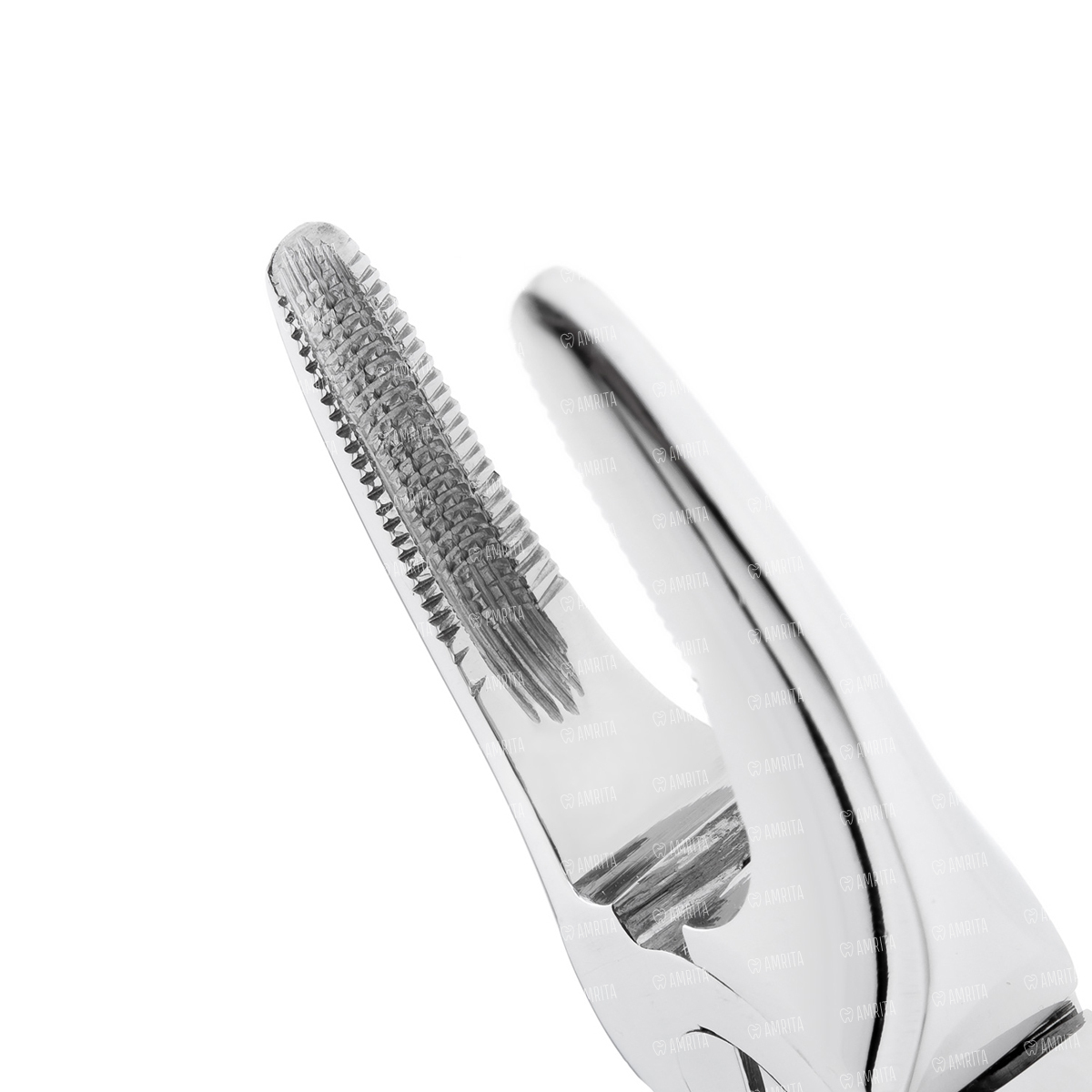 Прямые рабочие части щипцов, сходящиеся на конце, расположены в одной плоскости с продольной осью инструмента, благодаря чему при работе в фронтальном отделе корни зубов просто зацепить и удалить. На внутренней поверхности щечек имеются продольно-поперечные насечки, надежно фиксирующие корни при удалении.