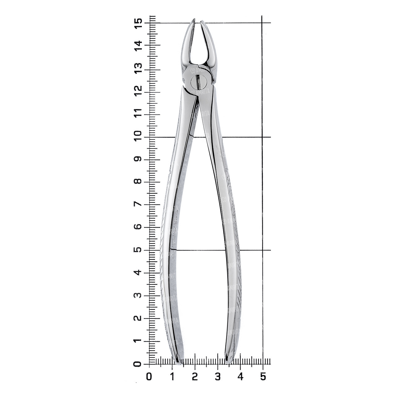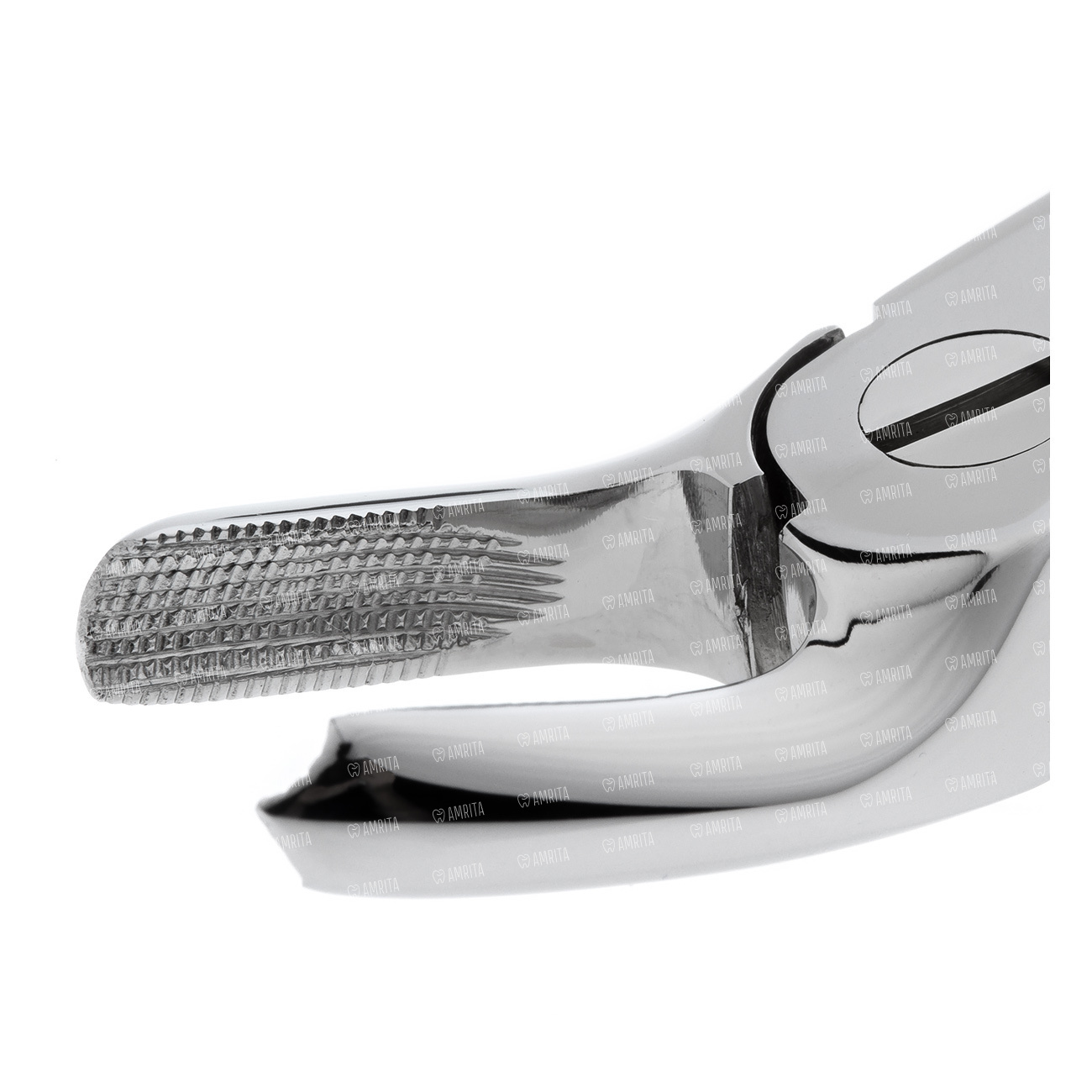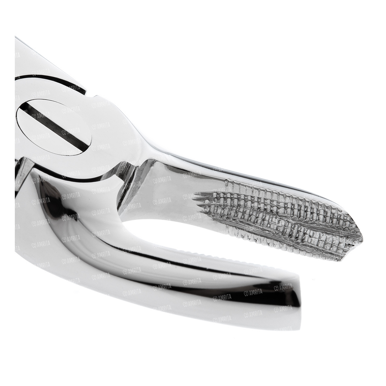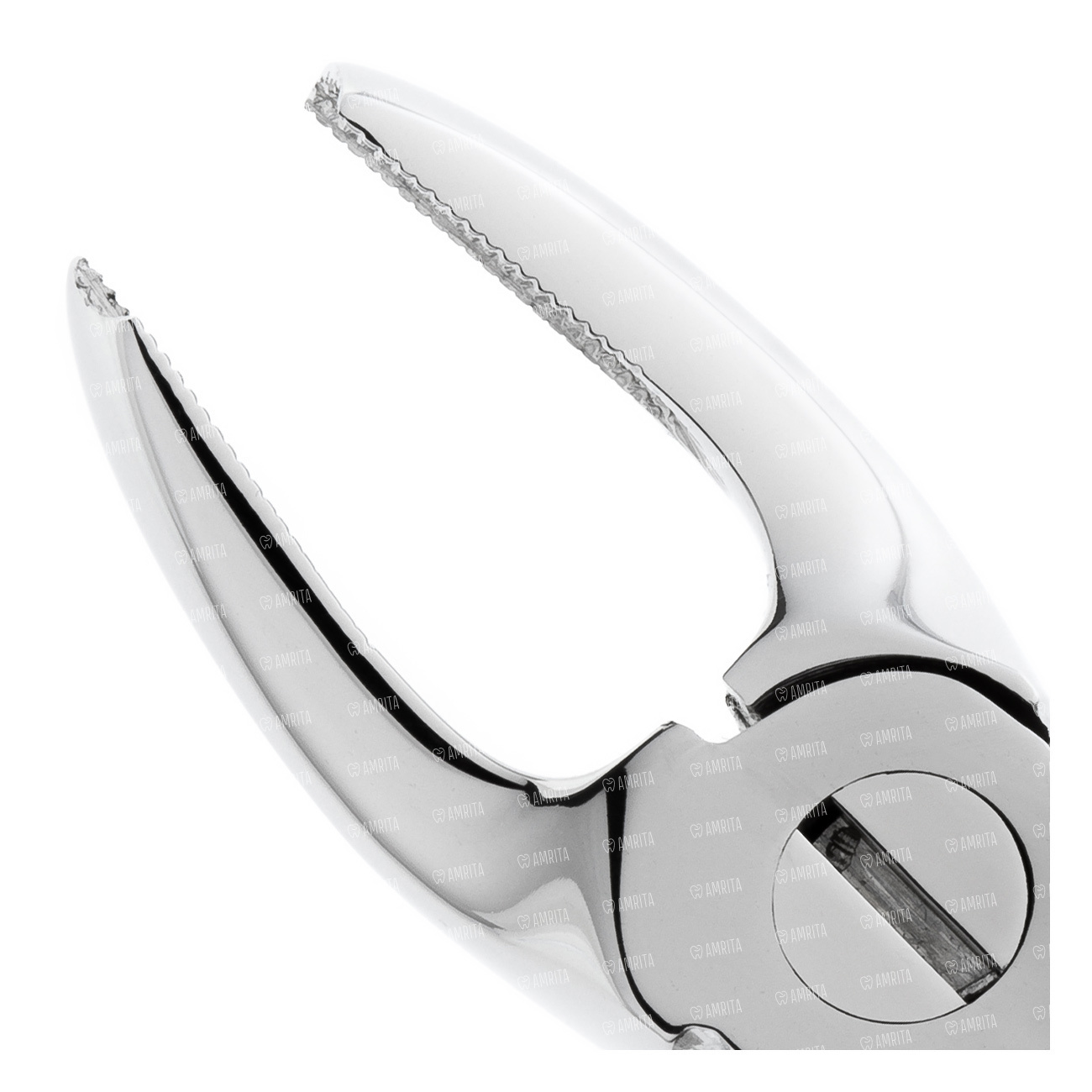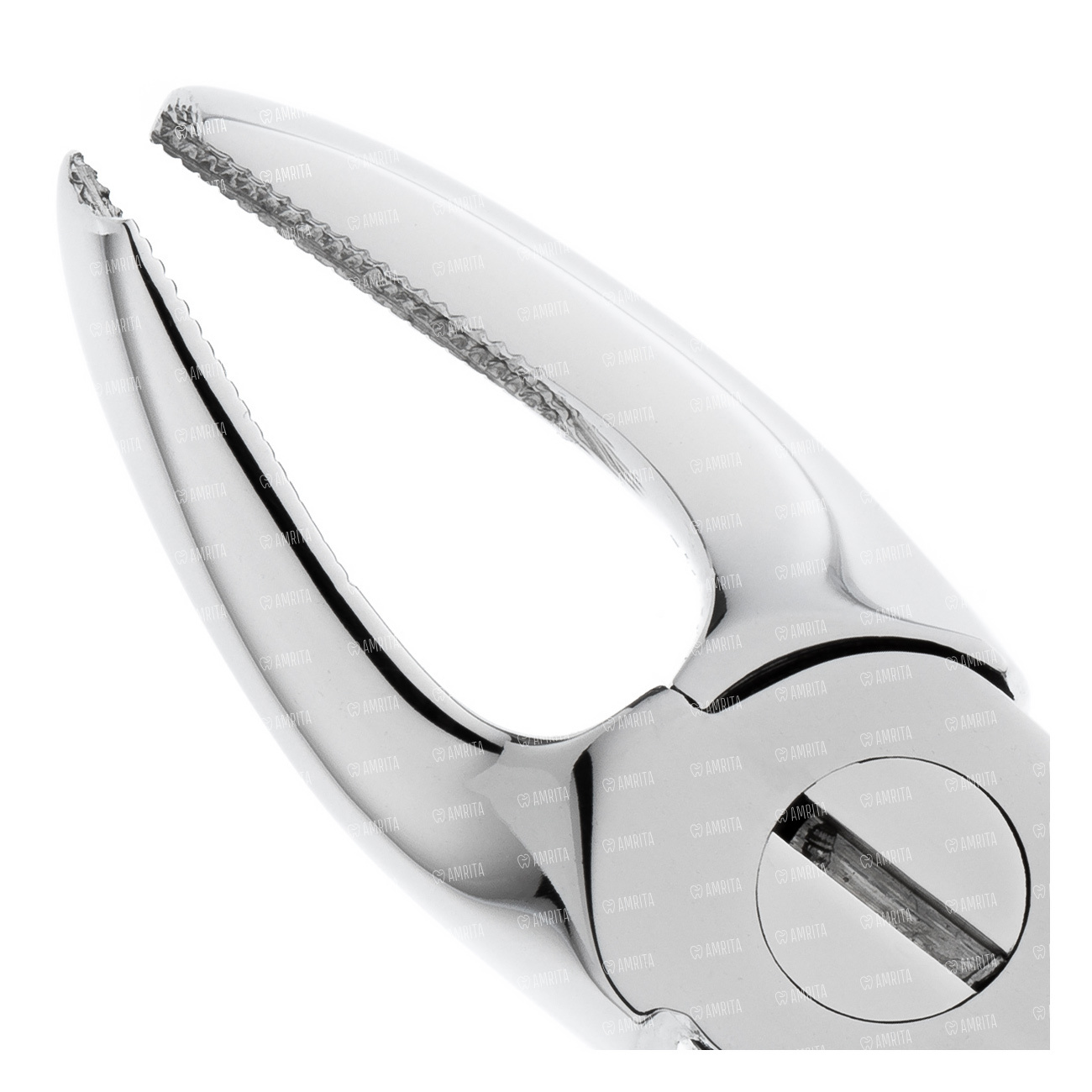 Ручки укороченной длинны. Шарнир пропорционально меньшего размера в сравнеи с щипцами для постоянных зубов этой же групповой принадлежности. Наружняя поверхность ручек покрыта стандартным ретенционным узором предотвращающим скольжение фаланг пальцев в латексной перчатке. Отполированы до зеркального блеска. В основании шарнирного соединения имеется тефлоновая вставка обеспечивающая плавный ход инструмента.