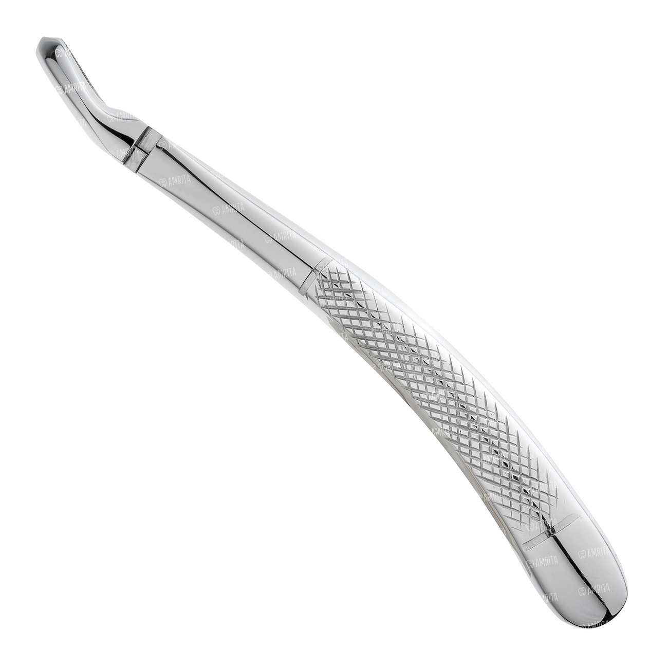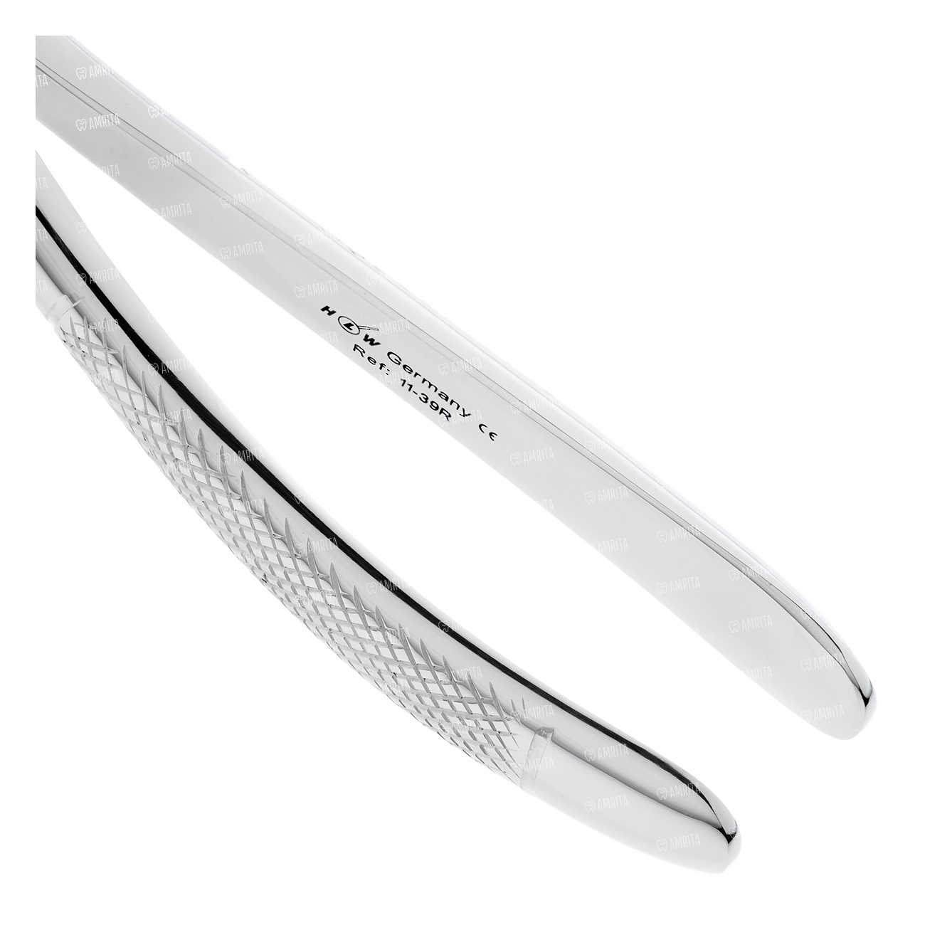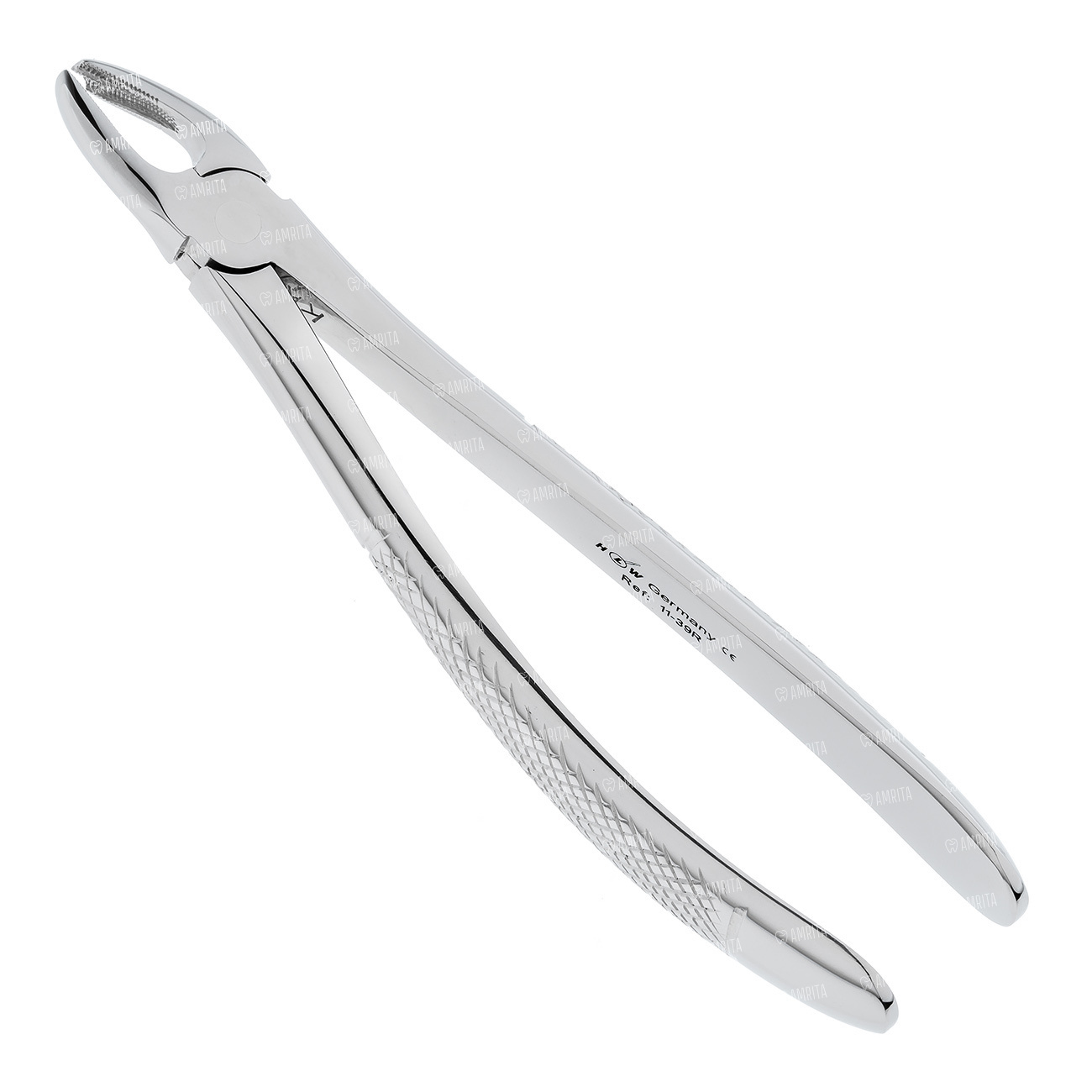 Щипцы для удаления моляров на верхней челюсти правые детские. Форма №39R. Щипцы имеют двойной изгиб по плоскости. Бранши не сходящиеся. Внутренняя поверхность рабочей части имеет поперечно-продольные насечки. Кончик левой бранши имеет фуркационный зуб.