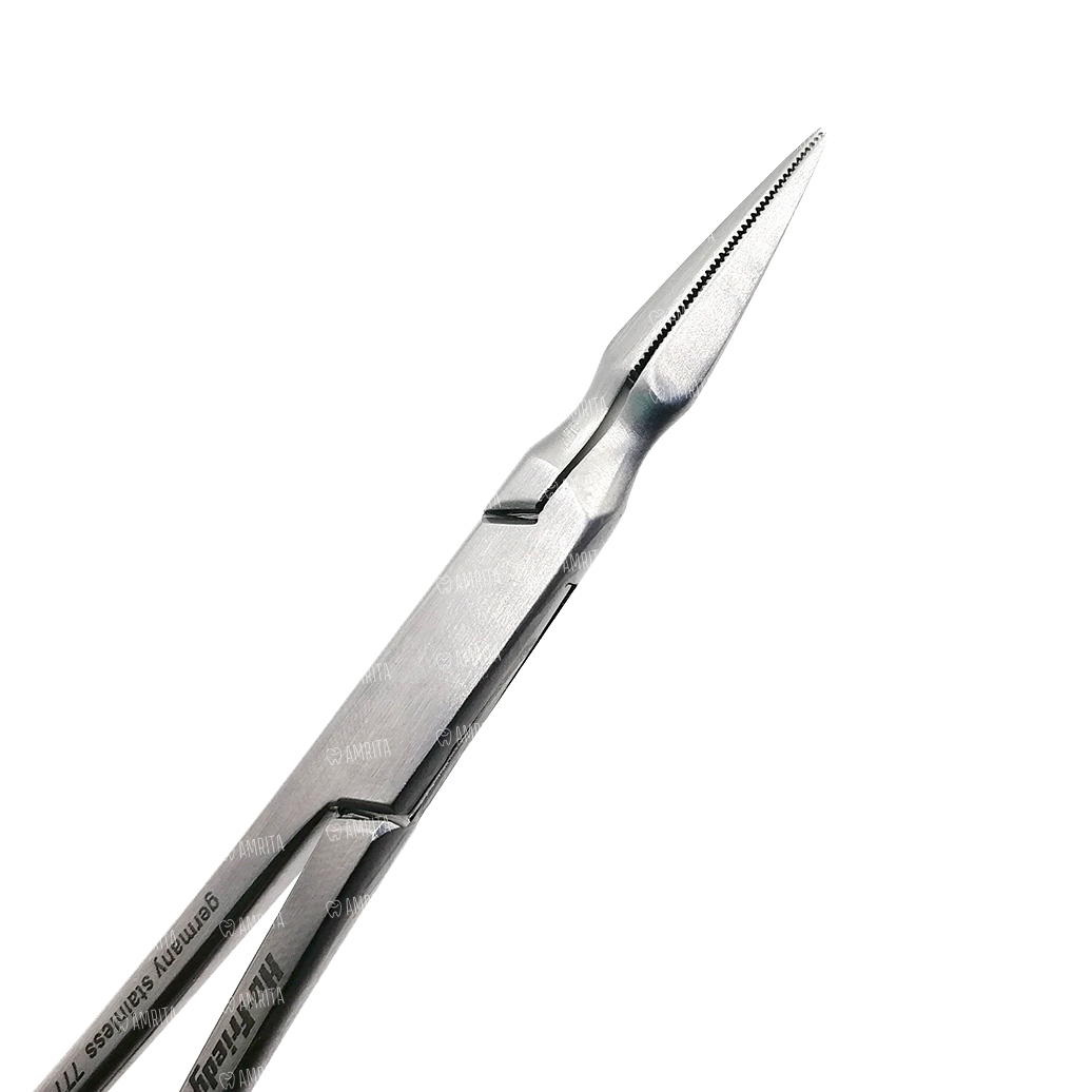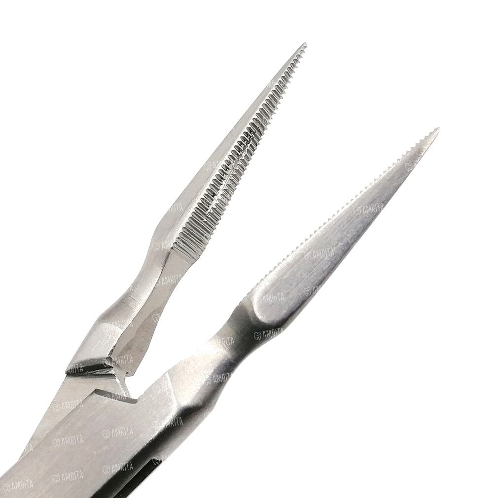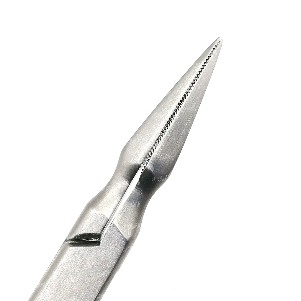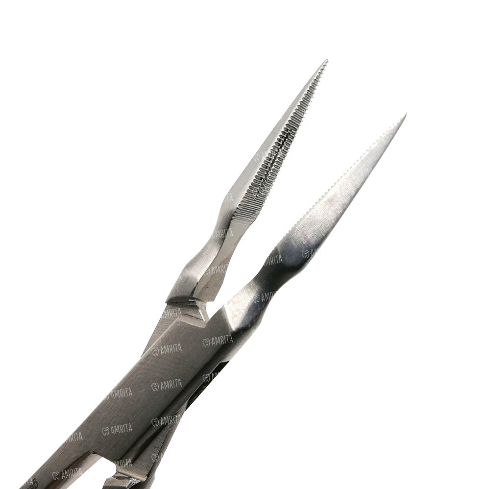 Прямые тонкие рабочие части легко захватывают коронки и их части. Шарнир обеспечивает легкую работу врача. Ограничители на ручках не дают сильно сжать рабочие части.