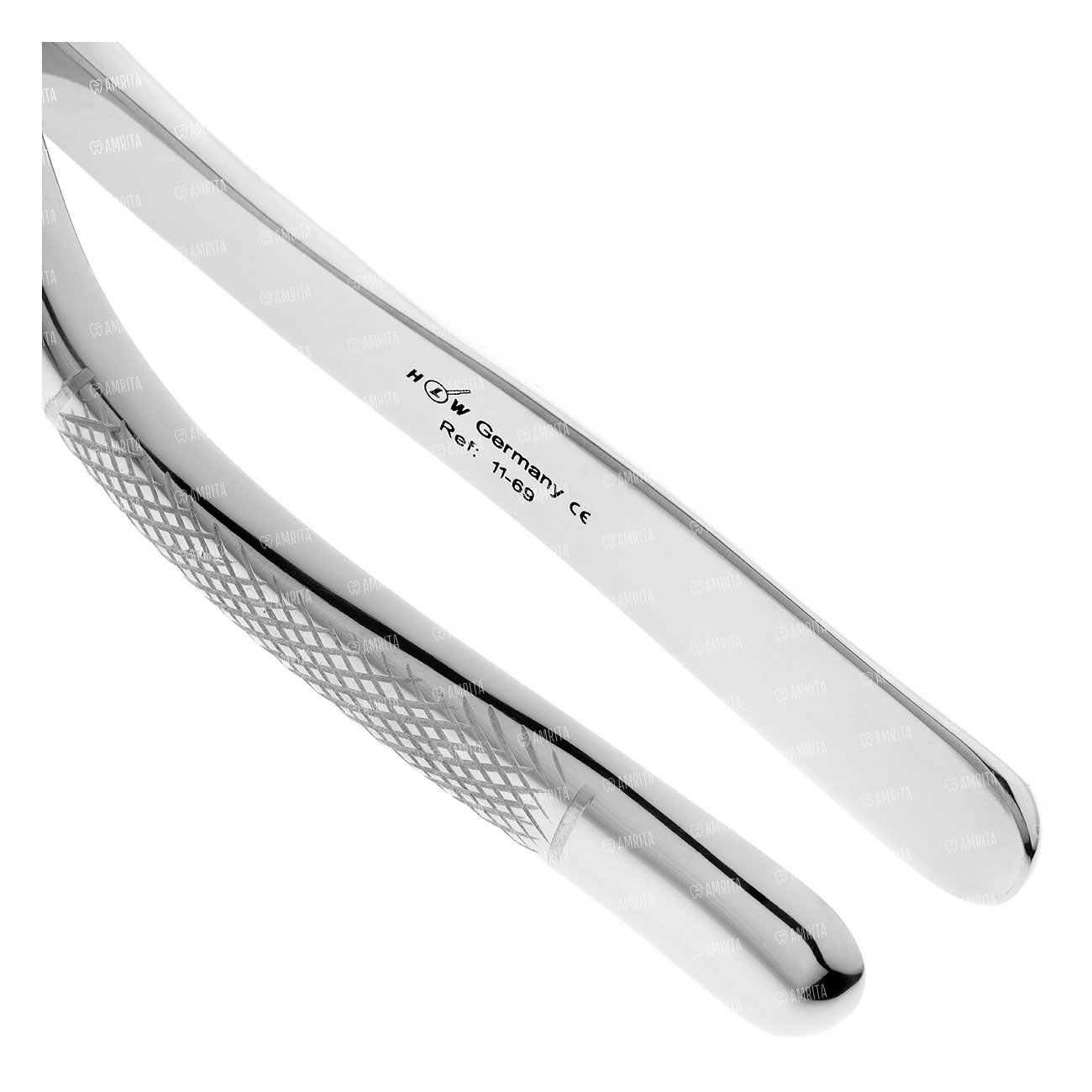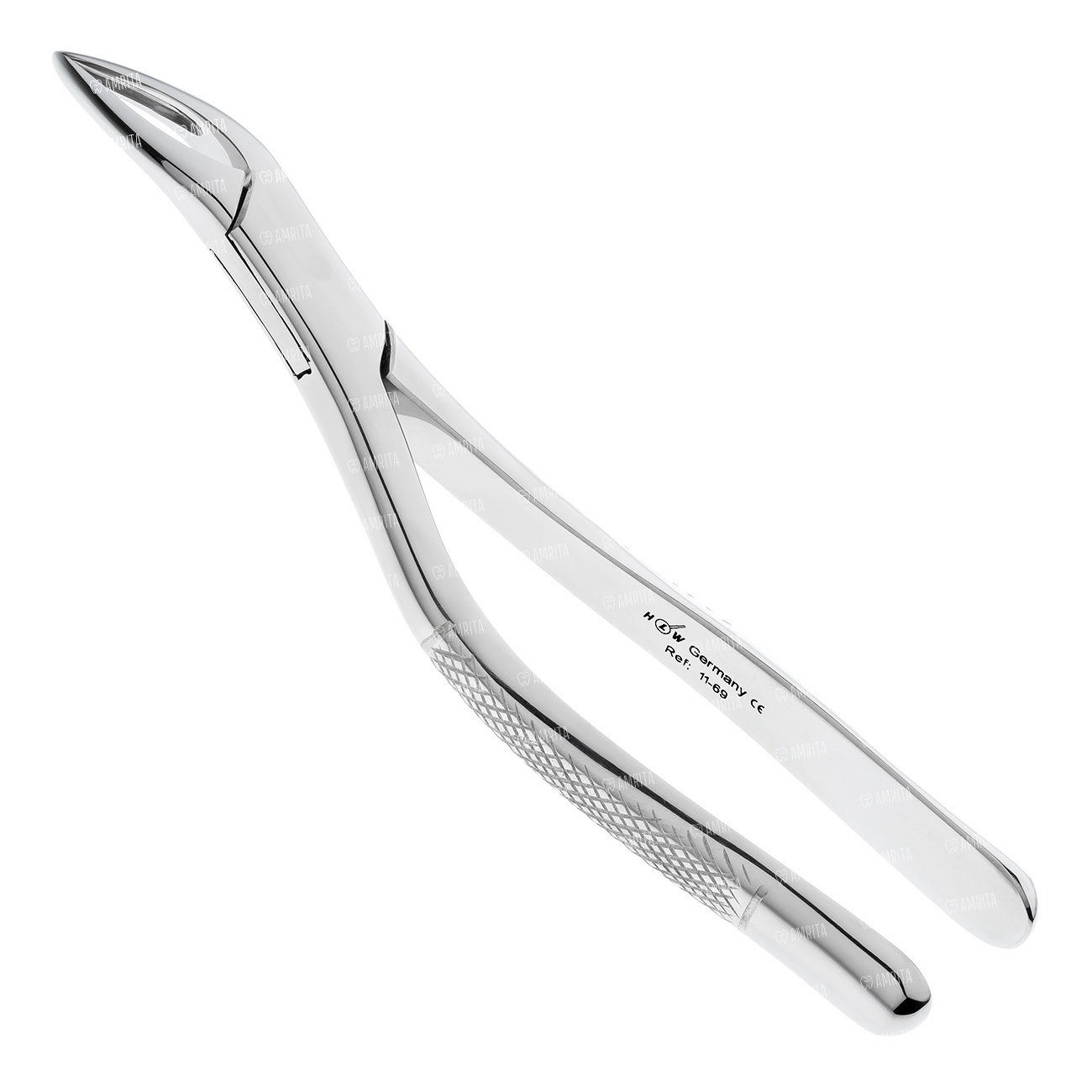 Щипцы для удаления фрагментов корней и зубов на верхней и нижней челюсти. Форма №69. Щипцы имеют двойной изгиб по плоскости. Бранши сходящиеся.