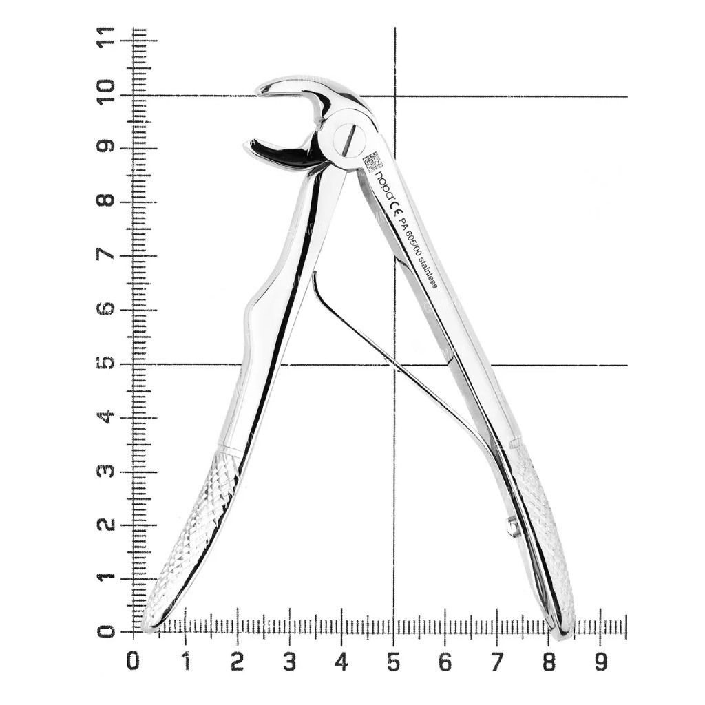 Щипцы формы № 51S торговой марки Nopa Instruments предназначены для удаления корней зубов на верхней челюсти. Инструмент имеет клювовидные рабочие части с продольными насечками.