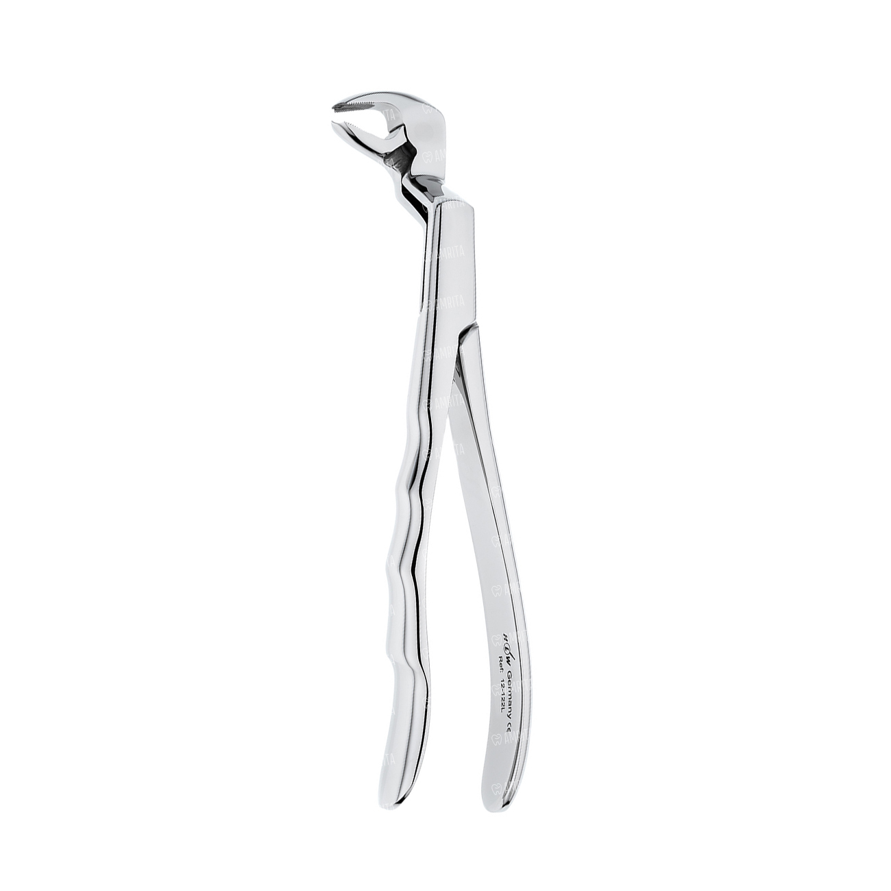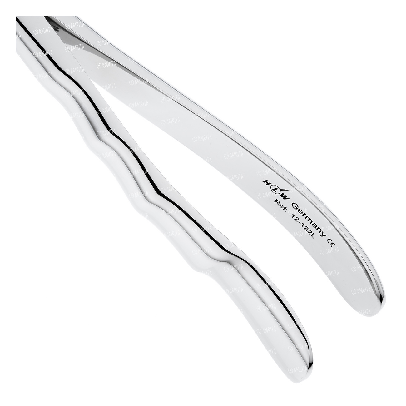 Щипцы HLW (Германия) предназначены для удаления левых моляров на нижней челюсти. Рабочие части инструмента не сходящиеся с шипами на концах. При наложении на зуб выступы входят в борозду между корнями, обеспечивая хорошую фиксацию щипцов на зубе. Внутренняя поверхность рабочей части имеет продольно-поперечные насечки, благодаря которым инструмент плотно захватывает зуб и облегчает его удаление.