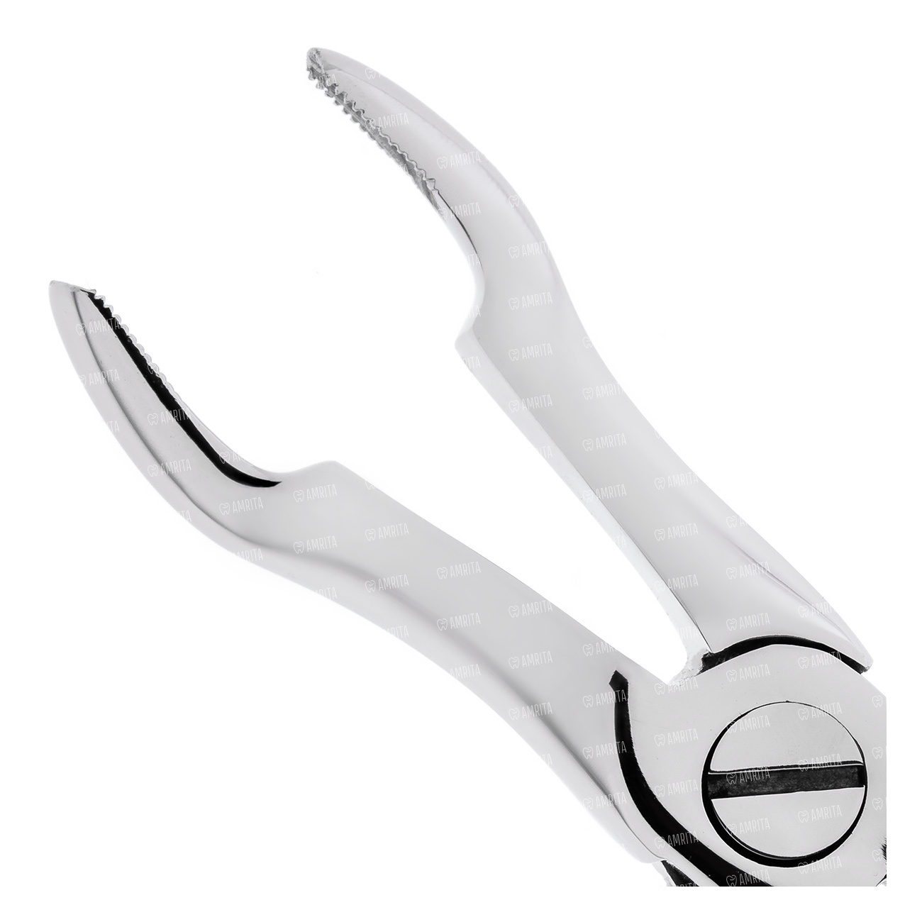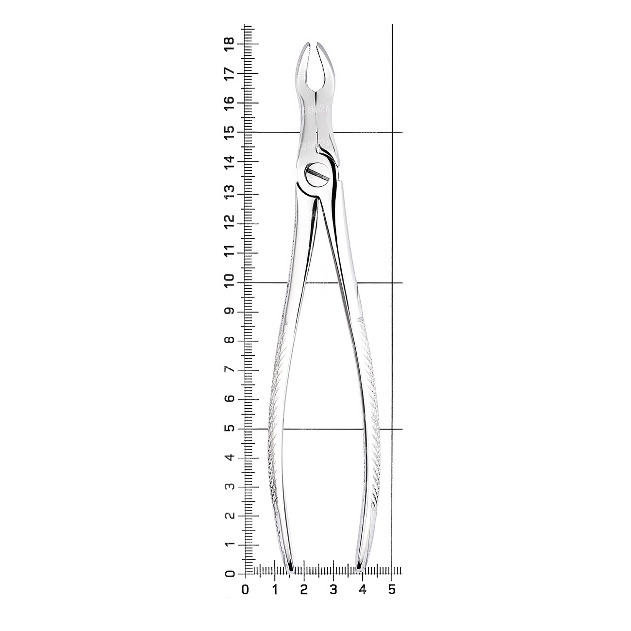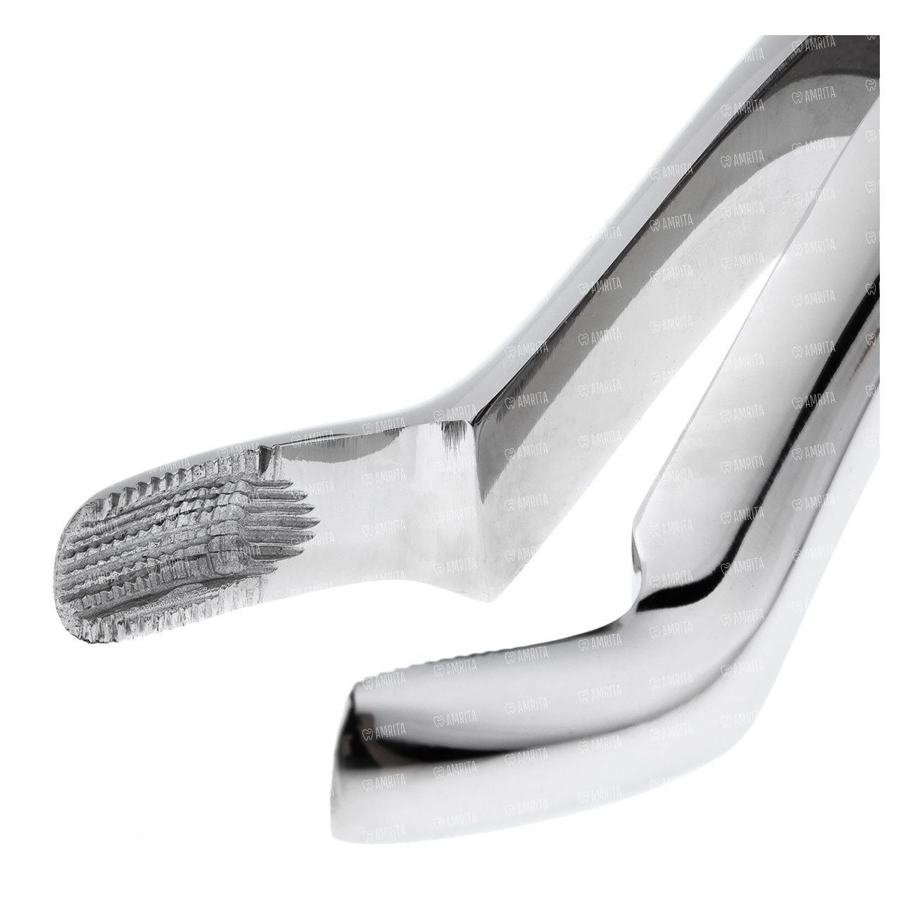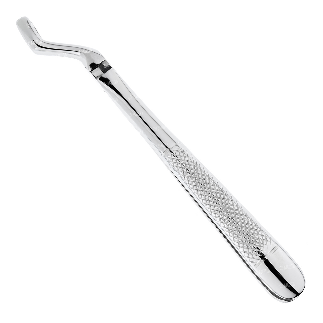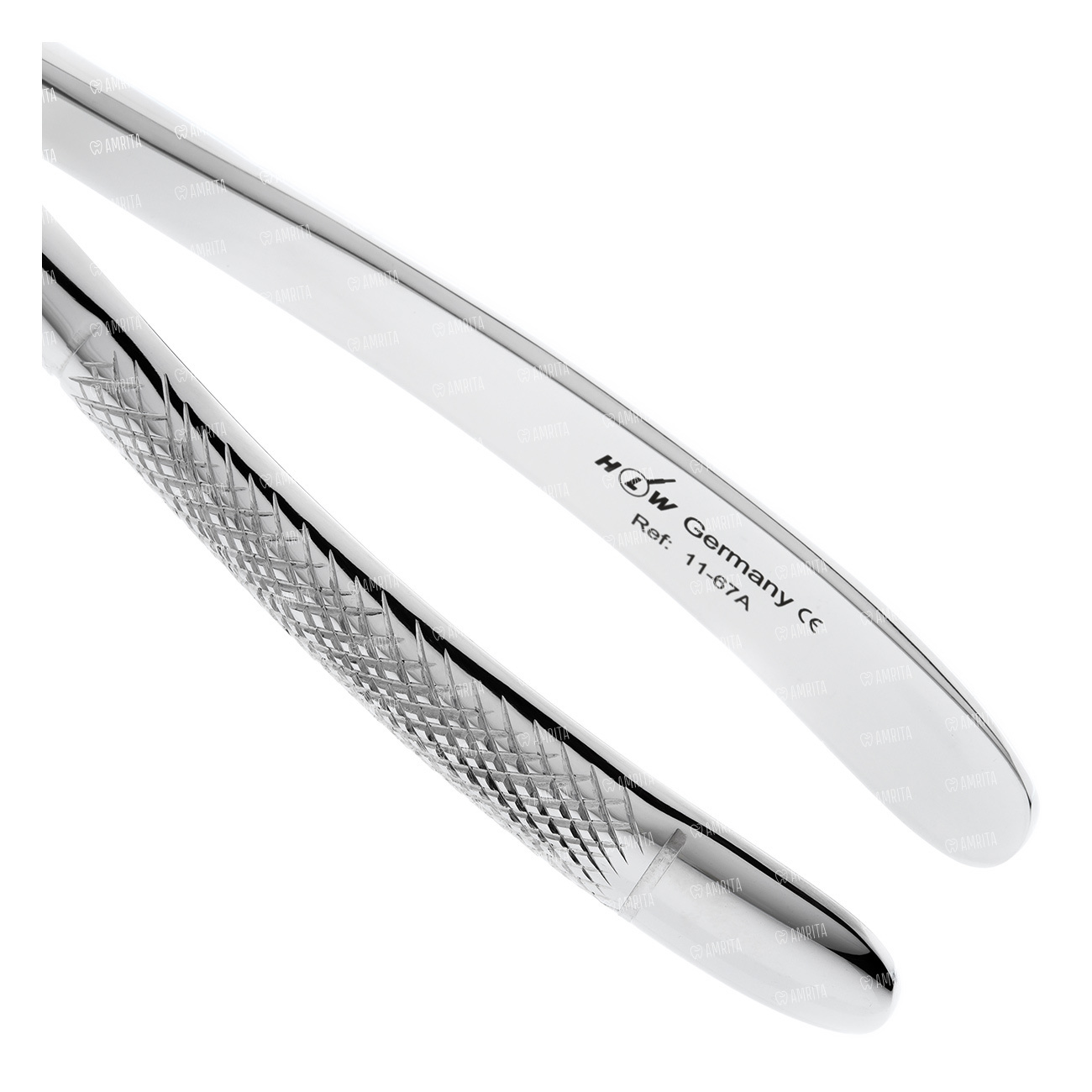 Щипцы для удаления третьих моляров верхней челюсти. Форма №67A. Бранши не сходящиеся. Рабочая часть имеет удлиненный штыковидный изгиб, обеспечивающий улучшенный доступ в дистальном отделе.