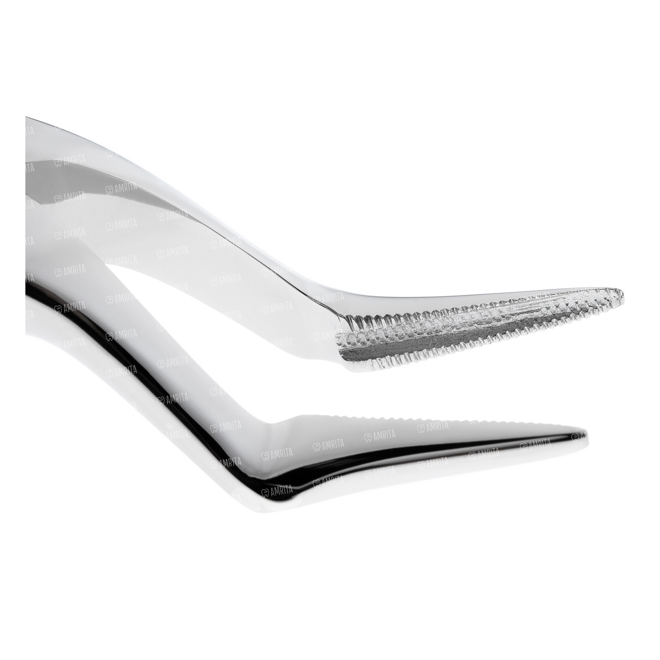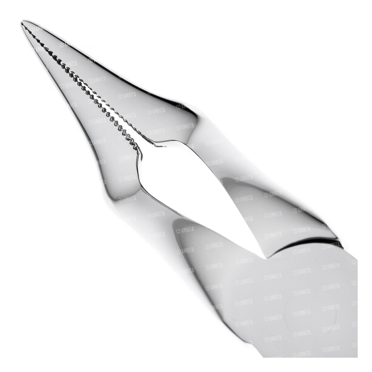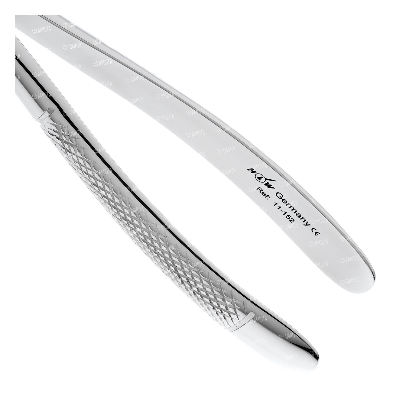 Щипцы для удаления корней на верхней челюсти узкие удлиненные. Форма №152. Бранши полностью сходящиеся удлиненные. Рабочая часть имеет штыковидный (байонетный) изгиб. Внутренняя поверхность рабочей части имеет поперечно-продольные насечки.